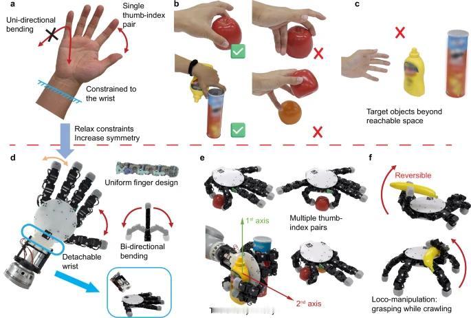 在我们仍对机器人精准叠衣、弹琴的技艺惊叹不已时,一款来自瑞士洛桑联邦理工学院的“巧手机器人”,已悄然改写着人们对机械肢体的认知。当地时间1月20日,这项研究刊载于《自然·通讯》,它不仅是一次技术突破,更让我看见人机协同的温柔可能,而中国研究员Xiao Gao的参与身影,更为这份跨界创新添注了别样暖意。 长久以来,机械手都在模仿人类手部的非对称结构,却也困于这份“模仿”——单面抓握、无法脱离基座,在狭窄空间或多任务场景中屡屡受限。而这款手掌直径仅16厘米的机械手,用对称设计撕开了突破口,五指与六指两款版本,能实现正反双面抓握,比人类手掌多了一份“无死角”的灵活。 其最惊艳之处在于可脱离基座自主爬行,靠内置驱动连续抓取3个物体后,仍能稳定对接机械臂。实验中,它既能抓起直径不足5厘米的卷筒芯,也能承载2公斤罐头,复现33种人类抓握姿态,精准度堪比人手。 这份灵巧绝非炫技:地震废墟中可穿缝抓取救援物资,仓储车间能高效分拣异形包裹,模块化设计比传统工业机器人更易落地,为柔性制造与应急救援开辟新路径。 这只小手打破了技术局限与刻板印象,从冰冷器械变为人类延伸的“伙伴”。技术主动适配人类需求,这样的创新才真正拥有打动人心的力量。