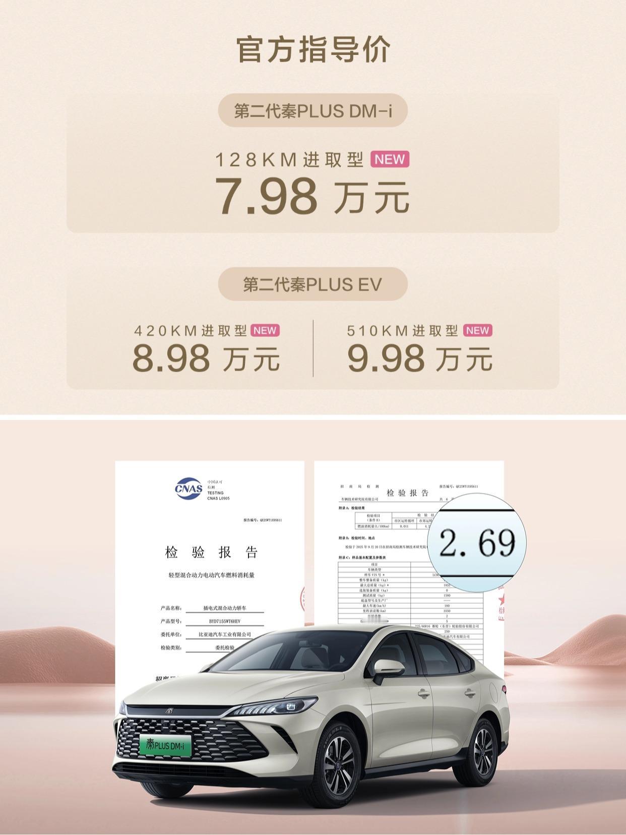 家轿冠军国庆献礼 第二代秦PLUS上新7.98万元 9月25日,比亚迪第二代秦PLUS双车加推三款“进取型”:DM-i 128KM版售7.98万元,EV 420/510KM版售8.98万元起。 新车续航更长、油耗更低,DM-i亏电油耗仅2.69L,全系升级怀挡、星河米车色,并标配多连杆悬架、NFC钥匙、VTOL电站等高配。上市半年已OTA升级20项功能,老车主同步受益。秦家族累销超150万辆,蝉联年度家轿冠军,此次上新降低高品质绿色出行门槛,再树A级价值标杆。 国庆前夕推出,比亚迪以国民价格致敬240万用户,让“有路就有秦”从口号照进现实,激发更多家庭自豪选择中国车。未来,秦PLUS仍将保持月更OTA节奏,持续推出萌宠桌面、游戏中心、无麦K歌等黑科技,把座舱变成移动客厅,既解压又带娃,实现“年年开新车”的承诺,陪伴用户拓展生活半径,驶向零碳幸福。【来自懂车帝车友圈】