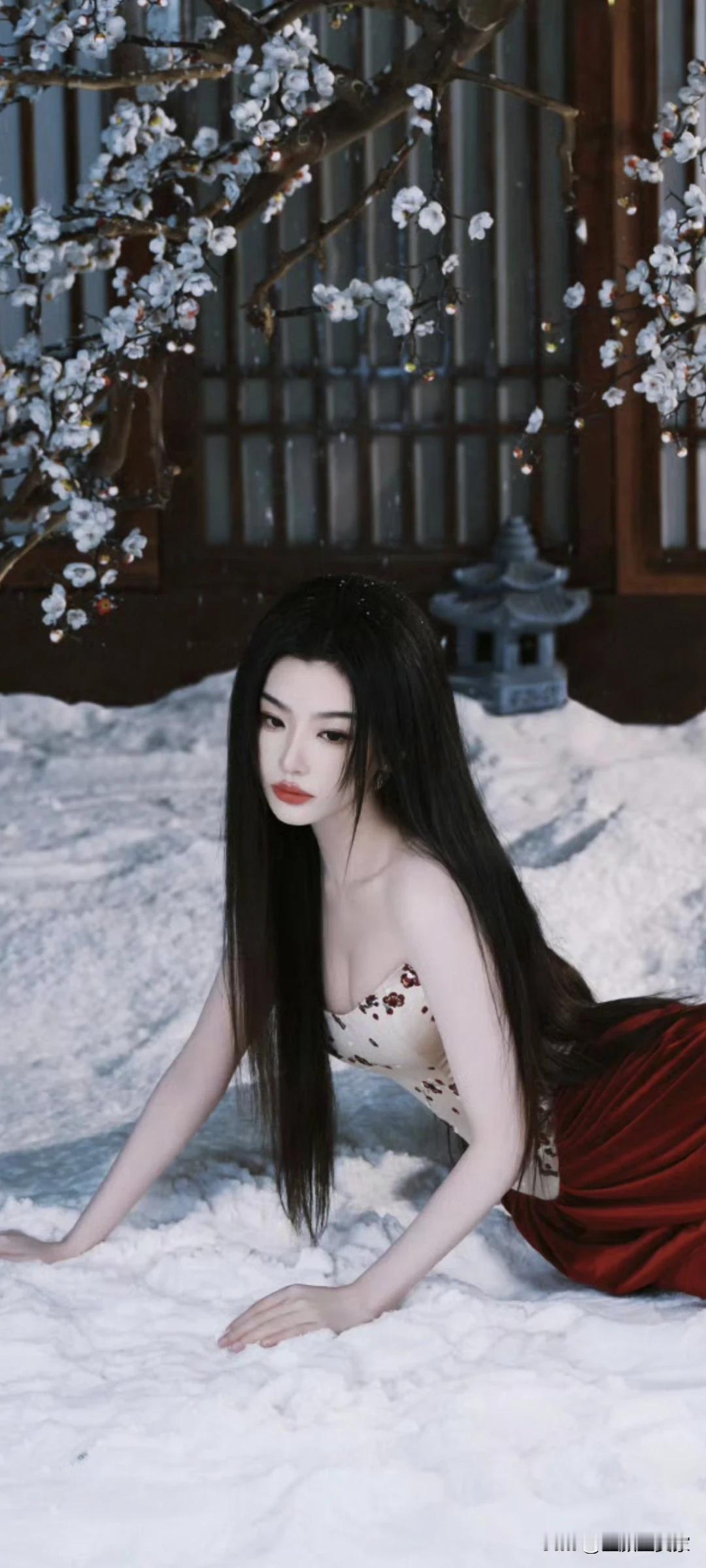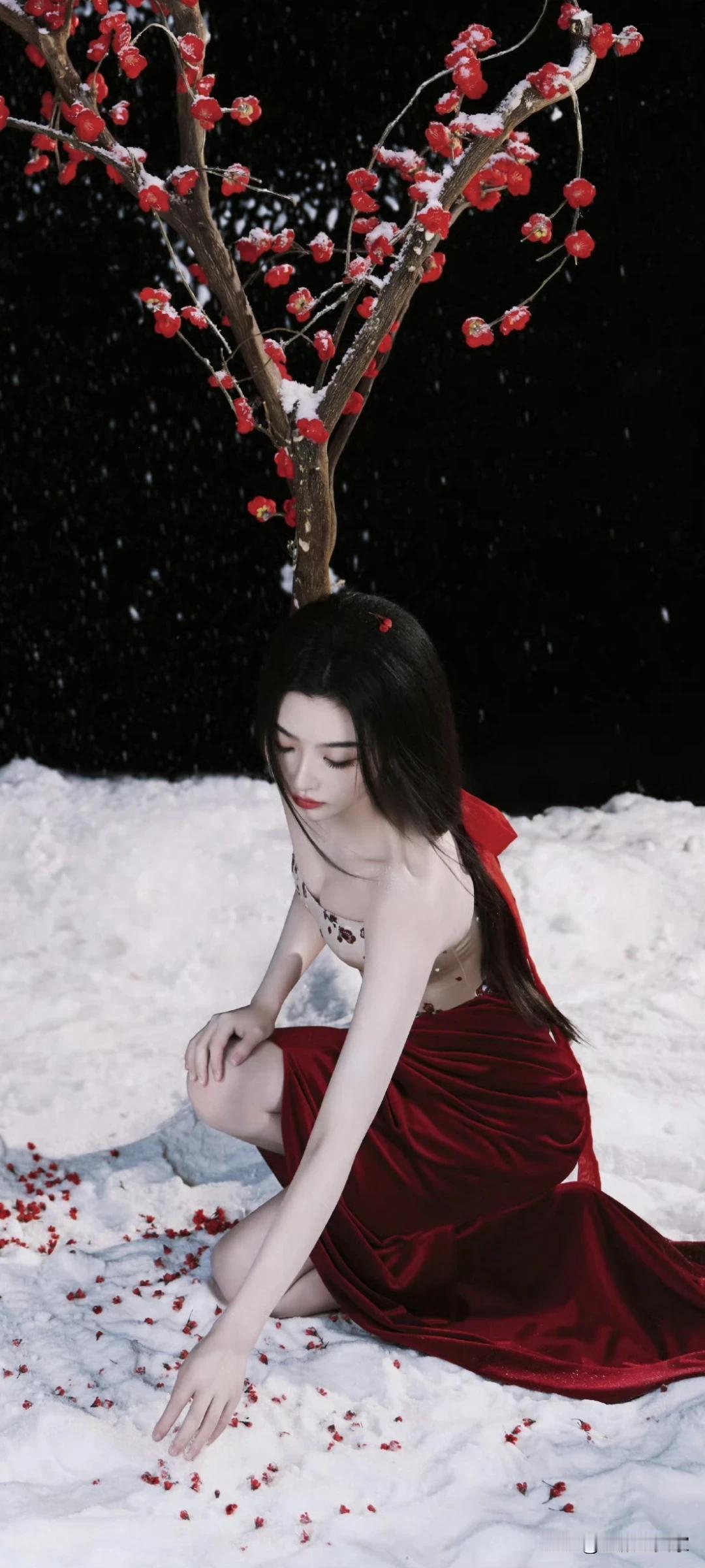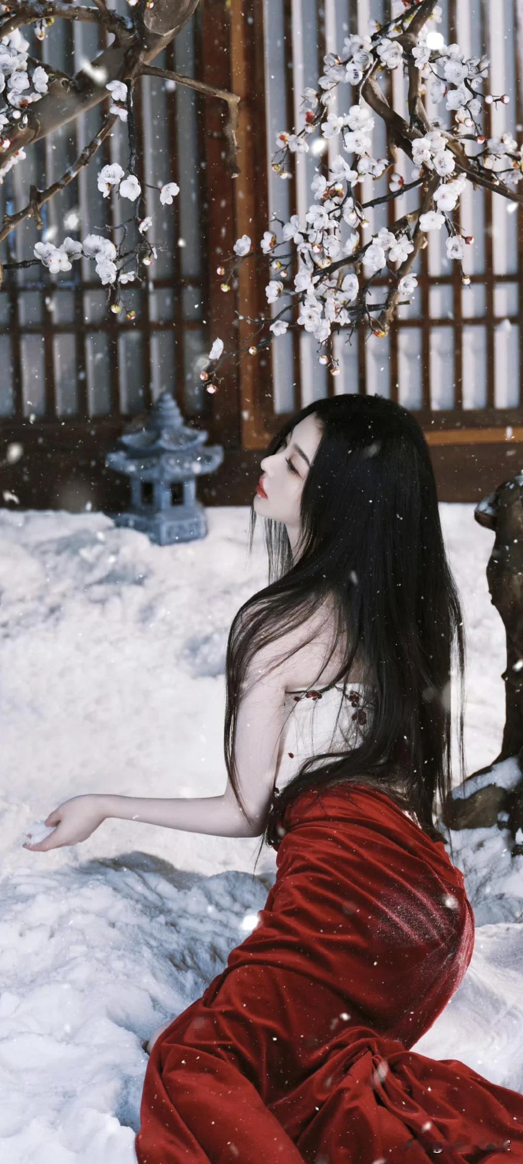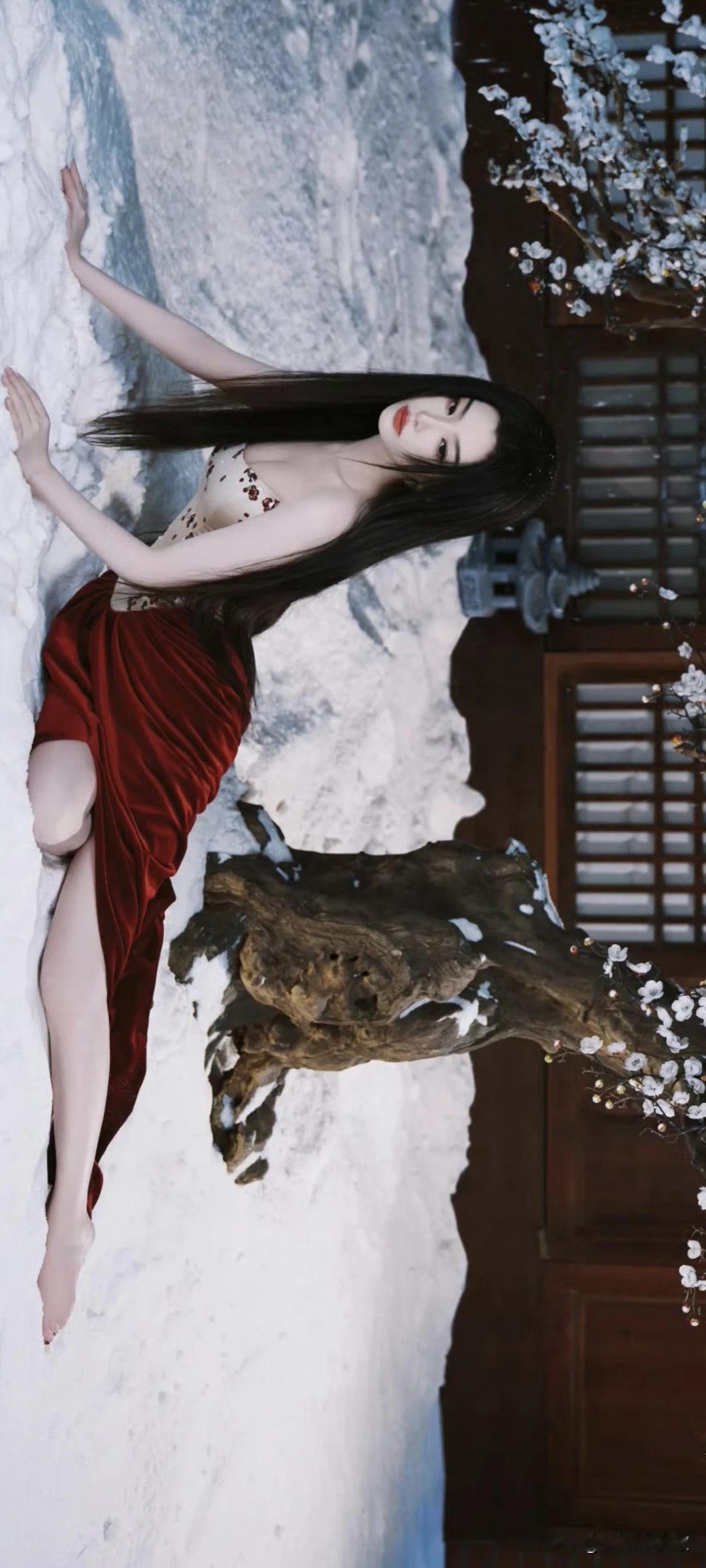孔雪儿写真壁纸~这红梅、白雪、红裙子一搭,往那一站,妥妥的冬日女神啊,这身材太绝
