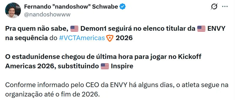 魔哥又有新工作啦!巴西媒体报道,Demon1与ENVY签了一年合约,会继续出战后面的VCT美洲赛事,也代表Demon1将在ENVY留队到2026年底。