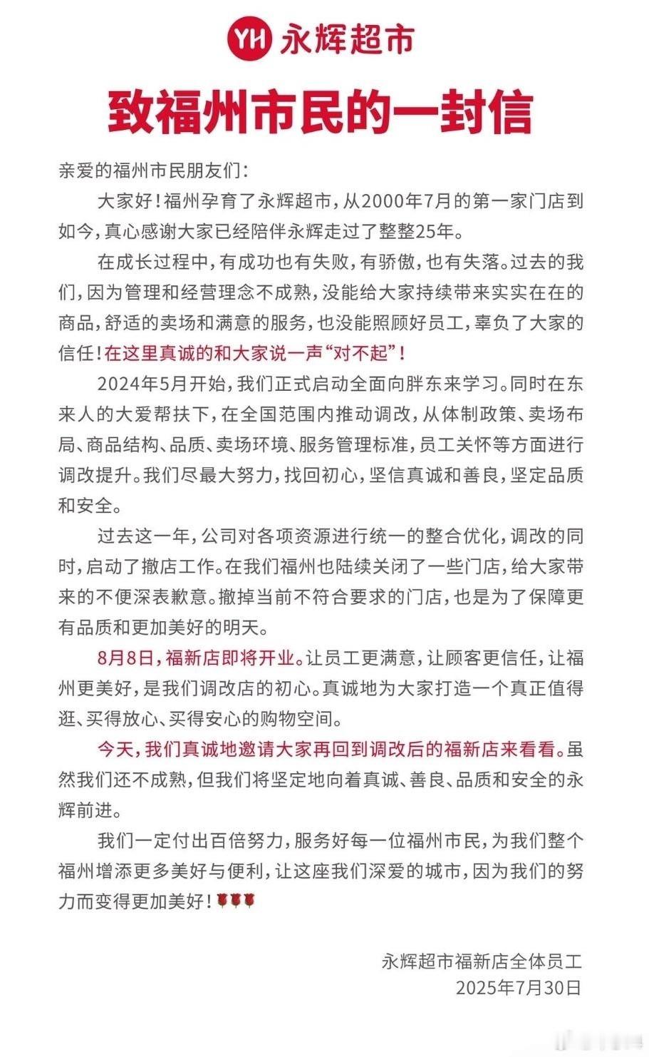 根据我这半年去永辉买东西的感受,我觉得永辉的商品还是可以的,种类多,品质也还不错,价格倒并不便宜,比本地的另一家大型连锁要贵一点点。而且很多便民服务也做得不错,比之前半死不活的永辉好太多了,这一点值得肯定。但我也关心,永辉是否真的学到了胖东来的精髓?也就是对待员工的态度,薪资待遇是否上去了,关怀是不是到位了,假期是不是给足了?“胖改”不止是学人家的服务水平,更要学人家呵护员工,否则就只能是“邯郸学步”。永辉超市CEO发全员信致歉永辉超市CEO说欲望超越了能力永辉超市半年关了227家店