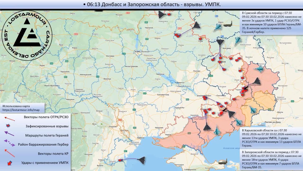 “炸!炸!炸!俄军开始大规模恢复星链制导无人机轰炸!”当地时间2026年2月9日-2月10日,俄军继续对乌克兰全境展开了猛烈大轰炸,俄罗斯空天军和俄罗斯火箭军对顿巴斯、苏梅州、哈尔科夫州、扎波罗热州、第聂伯罗彼得罗夫斯克州和赫尔松州的目标发动了打击,使用所有打击手段,特别是俄军继续发射星链制导的自杀式无人机,BM-35闪电-1/2自杀式无人机,轰炸了敖德萨州基利亚、切尔尼戈夫州扎多沃。 按照俄方的统计,2026年2月9日08:40,乌克兰第聂伯罗彼得罗夫斯克州爆炸, 俄军发射星链制导的自杀式无人机,BM-35闪电-1/2自杀式无人机;09:15,苏梅州科诺托普地区爆炸,俄军发射星链制导的自杀式无人机,BM-35闪电-1/2自杀式无人机;10:55,乌克兰苏梅州爆炸,俄军发射星链制导的自杀式无人机,BM-35闪电-1/2自杀式无人机;11:05,顿巴斯和第聂伯罗彼得罗夫斯克州爆炸,俄军发射星链制导的自杀式无人机,BM-35闪电-1/2自杀式无人机;11:09,乌克兰哈尔科夫州爆炸,俄军发射星链制导的自杀式无人机,BM-35闪电-1/2自杀式无人机;11:15,乌克兰扎波罗热州控制区爆炸,俄军发射星链制导的自杀式无人机,BM-35闪电-1/2自杀式无人机。 11:30,顿巴斯爆炸,俄罗斯空天军苏-34轰炸机投放了滑翔制导炸弹;12:13,哈尔科夫州爆炸,俄罗斯空天军苏-34轰炸机投放了滑翔制导炸弹;12:15 扎波罗热州爆炸,俄罗斯空天军苏-34轰炸机投放了滑翔制导炸弹;12:20,扎波罗热州再次爆炸,俄军发射星链制导的自杀式无人机,BM-35闪电-1/2自杀式无人机;12:55,乌克兰第聂伯罗彼得罗夫斯克州爆炸,俄罗斯空天军苏-34轰炸机投放了滑翔制导炸弹;13:55,顿巴斯地区爆炸,俄罗斯空天军苏-34轰炸机投放了滑翔制导炸弹。 14:45,第聂伯罗彼得罗夫斯克州瓦西里科沃爆炸,俄军发射星链制导的自杀式无人机,BM-35闪电-1/2自杀式无人机;15:30,苏梅州科诺托普爆炸,俄军发射星链制导的自杀式无人机,BM-35闪电-1/2自杀式无人机;15:34,乌克兰扎波罗热爆炸,俄军发射星链制导的自杀式无人机,BM-35闪电-1/2自杀式无人机;15:50,乌克兰扎波罗热州铁路区爆炸,俄罗斯空天军苏-34轰炸机投放了滑翔制导炸弹。 15:50,乌克兰斯拉夫扬斯克地区爆炸,俄军发射星链制导的自杀式无人机,BM-35闪电-1/2自杀式无人机;15:56 乌克兰第聂伯罗彼得罗夫斯克地区爆炸,俄军发射了伊斯坎德尔-М战术弹道导弹;16:50-00:55,在哈尔科夫州、苏梅州康托波尔、扎波罗热州、顿巴斯、第聂伯罗彼得罗夫斯克州、顿涅茨克州等地区爆炸,俄罗斯空天军苏-34轰炸机进行了30多次轰炸。 2月10日01:05-03:15,哈尔科夫州的兹洛奇夫地区、哈尔科夫市郊、哈尔科夫周边地、乌克兰敖德萨地区爆炸,俄军发射伊朗小摩托,沙赫德-136自杀式无人机;04:10:06:13,乌克兰苏梅地区、哈尔科夫州、顿巴斯、第聂伯罗彼得罗夫斯克州、扎波罗热州爆炸,俄罗斯空天军苏-34轰炸机进行轰炸。从上述轰炸信息来看,俄军恢复了大规模恢复使用星链制导的闪电自杀式无人机,开始精确轰炸乌克兰重点目标,甚至从俄军轰炸信息来看,俄军发射星链制导的自杀式无人机,作为开路先锋,优先察打一遍,乌克兰军队防空导弹,空情雷达是否恢复,然后俄军苏-34轰炸机放心开始大轰炸。