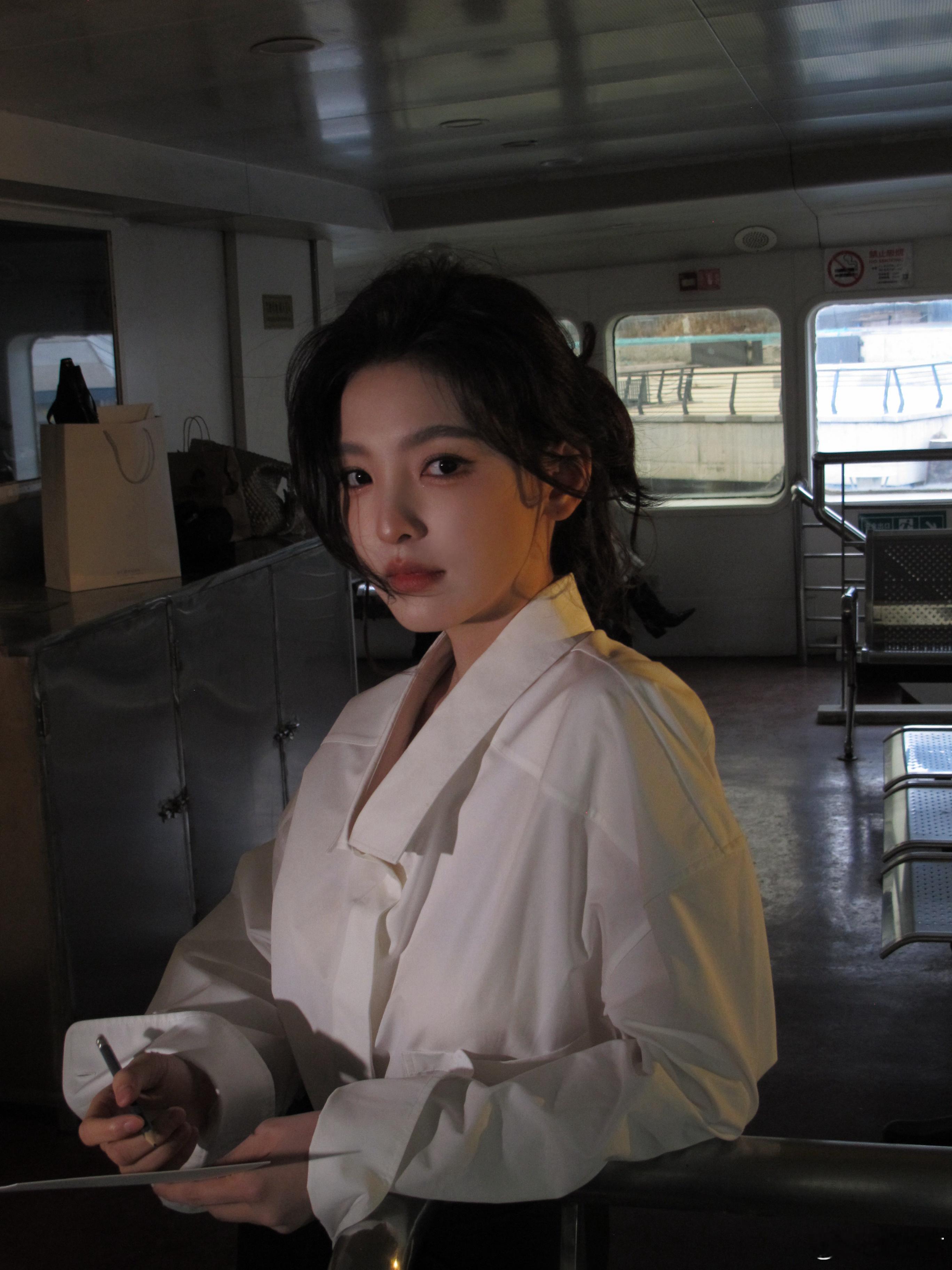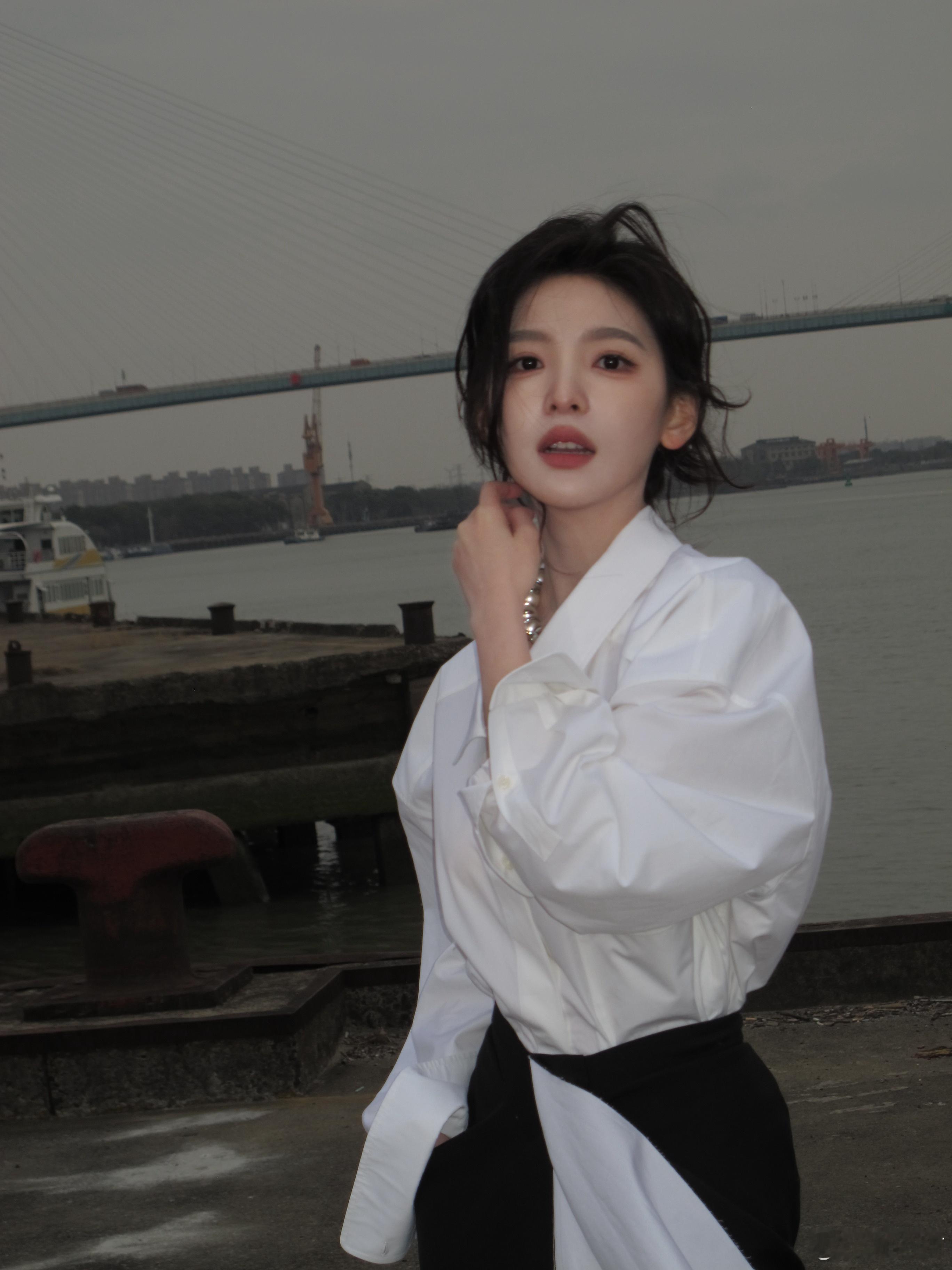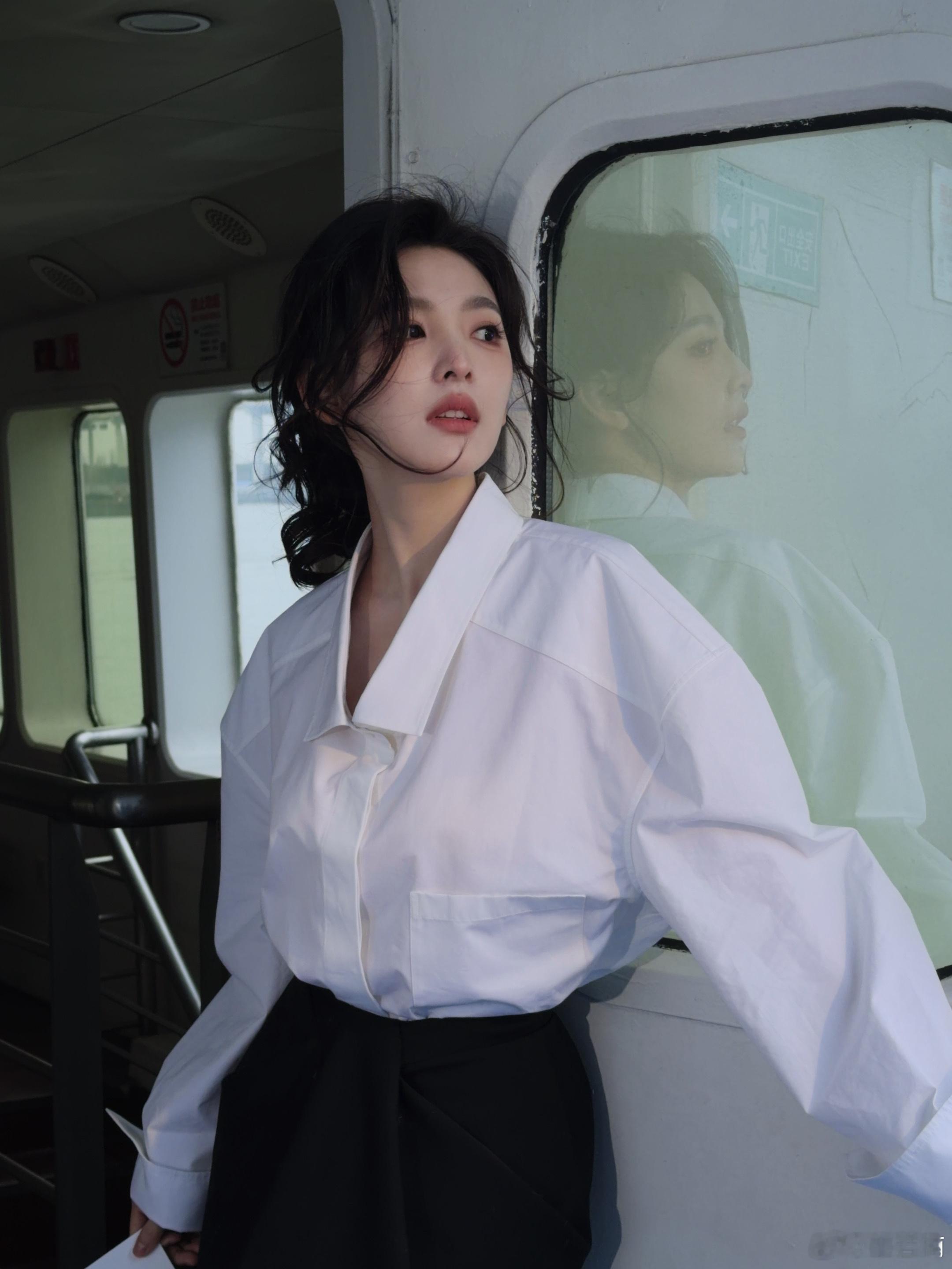 江风穿堂,轮渡轻摇,章若楠置身于江轮的光影褶皱里,用一身经典的黑白穿搭,把一段寻