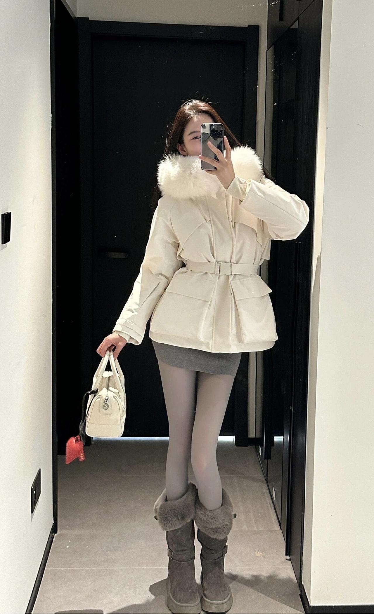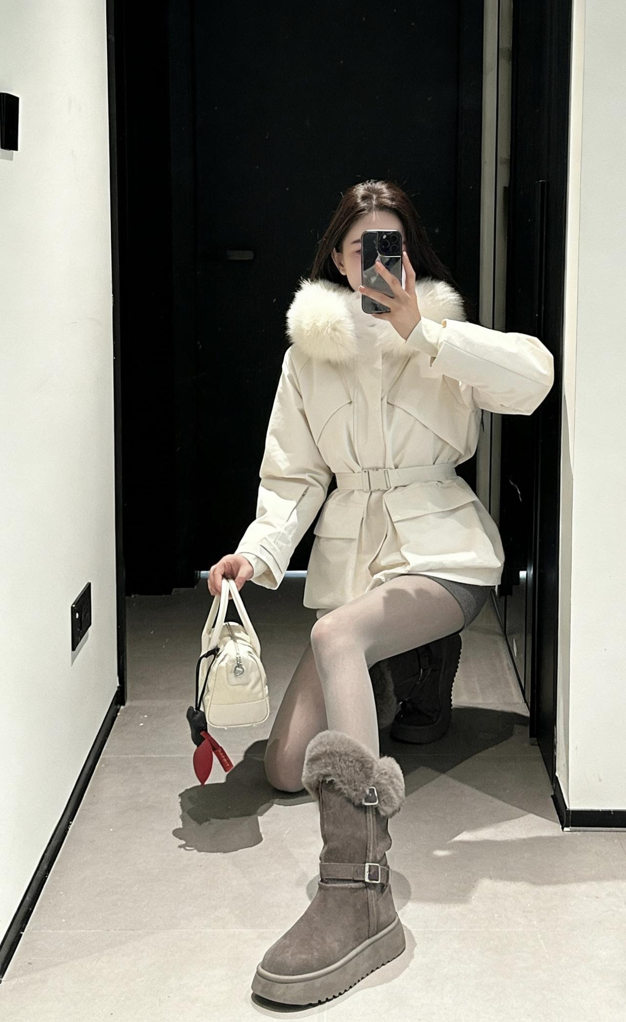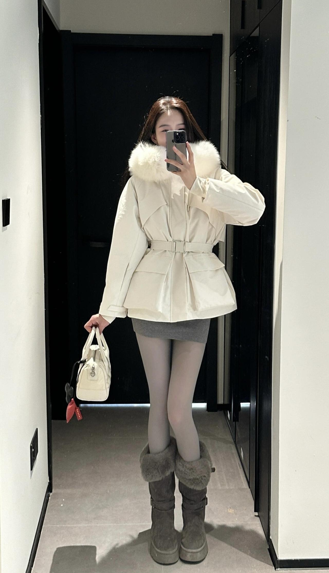 今日穿搭温柔冬日甜妹风,整体以米白、浅灰、奶咖为主,低饱和配色干净又显气质: • 上衣:米白色收腰羽绒服,大毛领增加了温暖感和视觉重点,腰带设计巧妙地收紧腰线,避免了羽绒服的臃肿感,同时提升了利落感。 • 下装:深灰色针织短裙,中和了上衣的甜腻,增加了一丝轻熟感,搭配浅灰色连裤袜,既保暖又能修饰腿部线条。 • 鞋包:浅咖色毛绒厚底雪地靴,毛绒翻边设计呼应了毛领,厚底还能悄悄增高;搭配白色迷你手提包,整体色调统一,精致又可爱。 适合场合: • 日常出行:上学、通勤、逛街、探店,保暖又上镜,轻松应对冬日街头。 • 休闲约会:和朋友下午茶、看电影,温柔又不失活泼,很容易拍出氛围感照片。 • 冬日短途旅行:兼顾保暖与造型感,在雪景或城市街头都很出片。