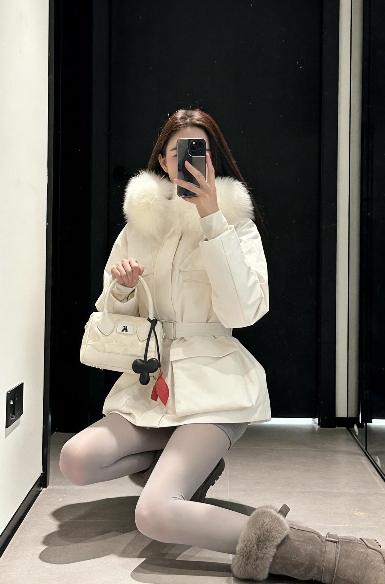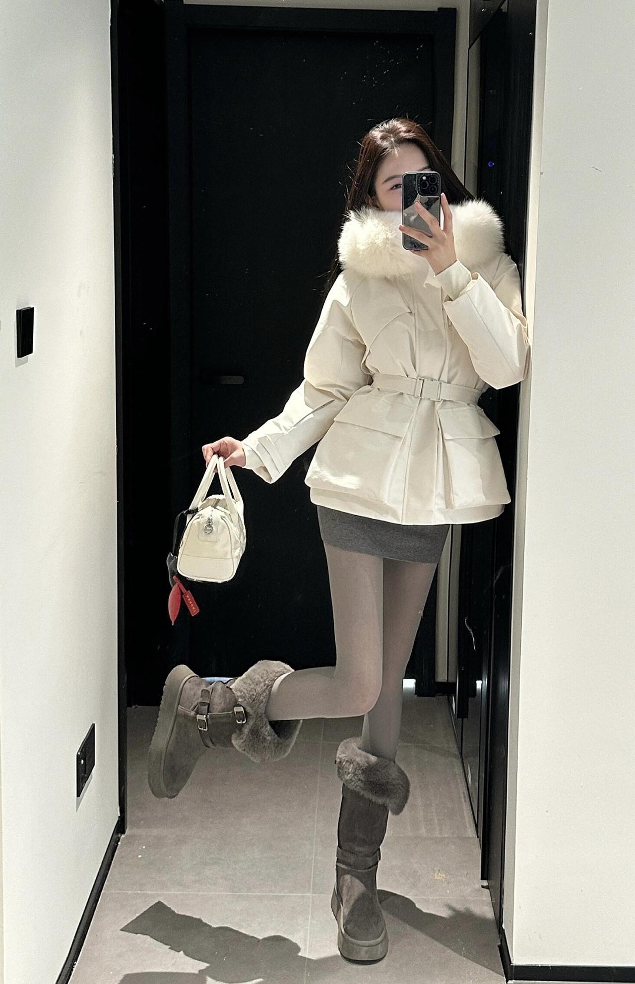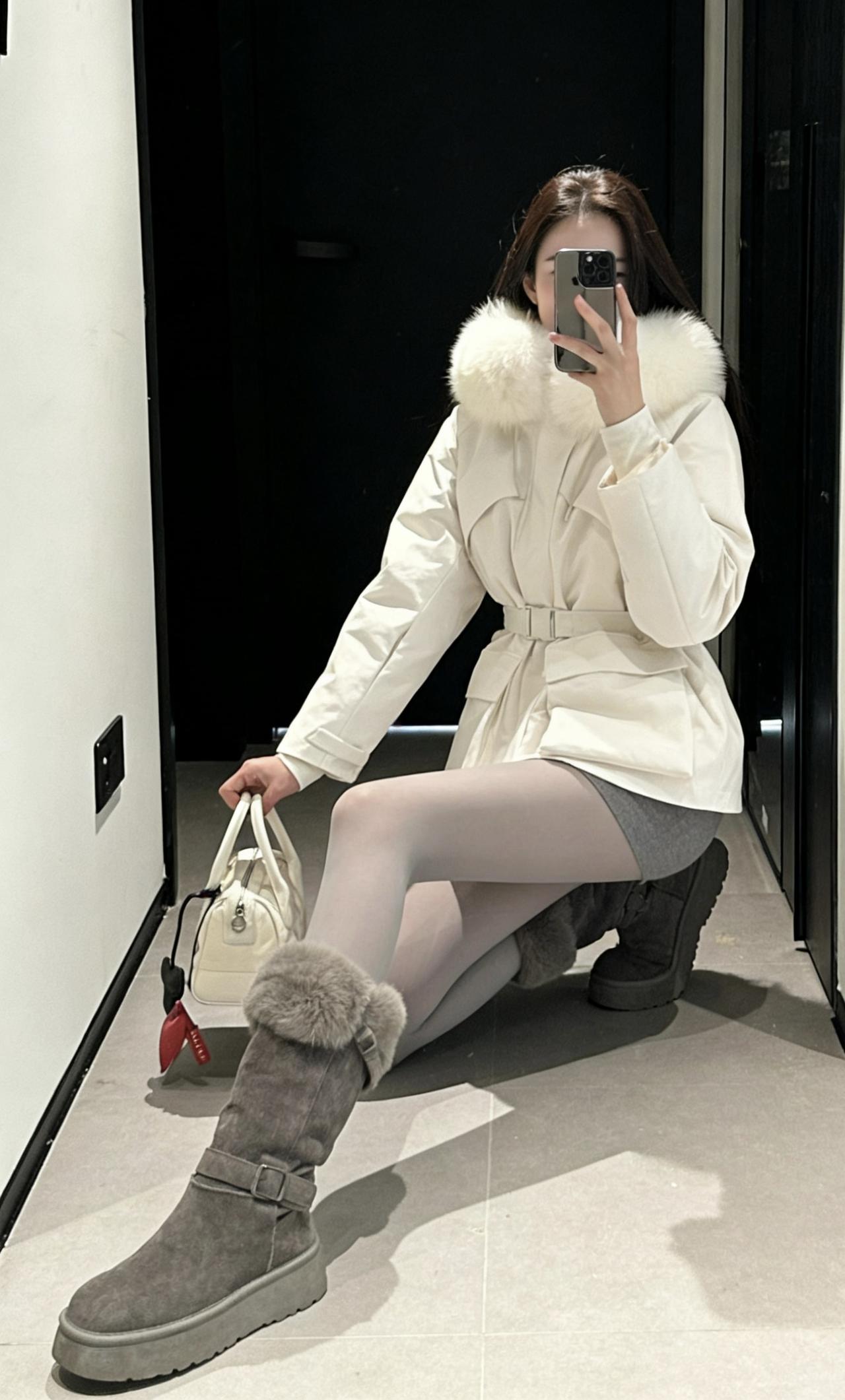 今日穿搭温柔冬日甜妹风,整体以米白、浅灰、奶咖为主,低饱和配色干净又显气质: • 上衣:米白色收腰羽绒服,大毛领增加了温暖感和视觉重点,腰带设计巧妙地收紧腰线,避免了羽绒服的臃肿感,同时提升了利落感。 • 下装:深灰色针织短裙,中和了上衣的甜腻,增加了一丝轻熟感,搭配浅灰色连裤袜,既保暖又能修饰腿部线条。 • 鞋包:浅咖色毛绒厚底雪地靴,毛绒翻边设计呼应了毛领,厚底还能悄悄增高;搭配白色迷你手提包,整体色调统一,精致又可爱。 适合场合: • 日常出行:上学、通勤、逛街、探店,保暖又上镜,轻松应对冬日街头。 • 休闲约会:和朋友下午茶、看电影,温柔又不失活泼,很容易拍出氛围感照片。 • 冬日短途旅行:兼顾保暖与造型感,在雪景或城市街头都很出片。