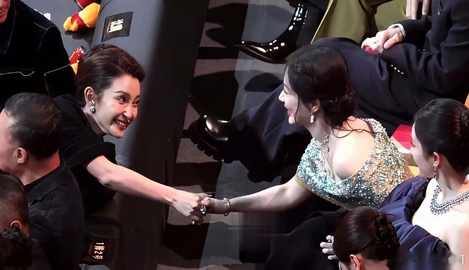 李冰冰走过来了。镜头先给到辛芷蕾,她“腾”地一下就从椅子上弹起来,整个人几乎是弓着出去的,双手握住李冰冰,头点了一下,笑容一丝不苟。镜头往旁边一扫,杨幂稳稳地坐在那。背挺得笔直,视线平视前方,直到李冰冰的身影完全挡住她面前的灯光,手已经伸了过来,她这才抬起手,身子就往前那么轻轻地探了一下,握完了。再下一个,杨紫。她没站起来,但整个上半身都用力倾向李冰冰那边,腰弯出了一个很低的弧度,手递过去,带着笑。一排三个人,一个站着,一个坐着,一个欠着身。有时候,一张椅子,就能照出一个人在圈子里的活法。