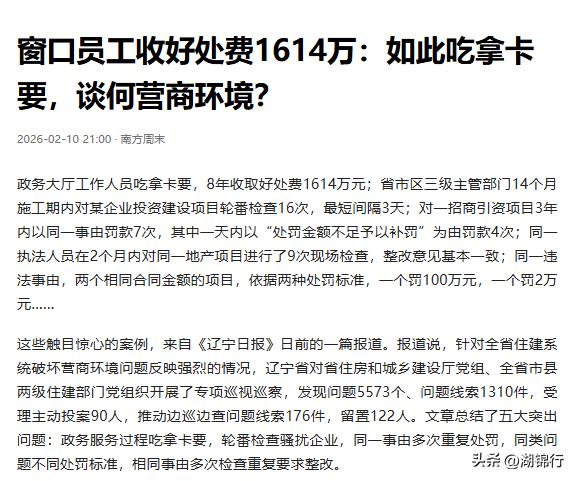 窗口 8 年敛财 1614 万!微权力成贪腐利器,监管漏洞谁来堵? 辽宁住建系统曝出的窗口人员 8 年收 1614 万好处费的消息,直接刷新了对微权力贪腐的认知。 一个普通的政务窗口工作人员,只是负责接件转办,却能把公权变成私产,送钱就当天办,不送钱就百般刁难,平均一年捞 200 多万,每天入账五千多,这哪里是办事窗口,分明是个人的 “收款码”! 更离谱的是,这样明目张胆的吃拿卡要,居然能持续 8 年不被发现,背后的监管漏洞细思极恐。政务窗口本是直面企业和群众的前沿,理应是监督最严格、流程最透明的地方,可偏偏成了贪腐的温床。是监督机制形同虚设,还是内部有人视而不见、甚至利益勾结?很难想象这 8 年间,有多少企业为了办事被迫低头,有多少人因无故拖延错失良机。 这起 “小官巨贪” 的案例,绝不是个例。辽宁专项巡视仅三个月,就查出住建系统 5573 个问题、1310 条线索,留置 122 人,足以见得乱象之深。这些手握微权力的人,看似官小,却能掐住企业发展的 “咽喉”,而监管的缺位,更是让他们有恃无恐。 微权力再小,也关乎民生和营商环境。窗口人员的一举一动,代表的都是政府形象,这样的贪腐行为,不仅寒了企业和群众的心,更让政务公信力大打折扣。 揪出这个 “硕鼠” 只是第一步,更重要的是补上监管的漏洞:让办事流程标准化、透明化,给权力装上 “摄像头”,畅通举报渠道,让微权力无处可贪。唯有把监管落到实处,才能让政务窗口真正成为为民服务的暖心窗口,而不是权力寻租的暗箱。