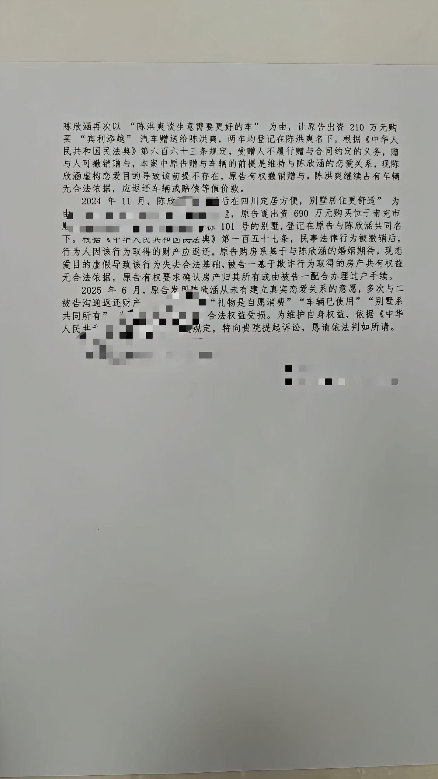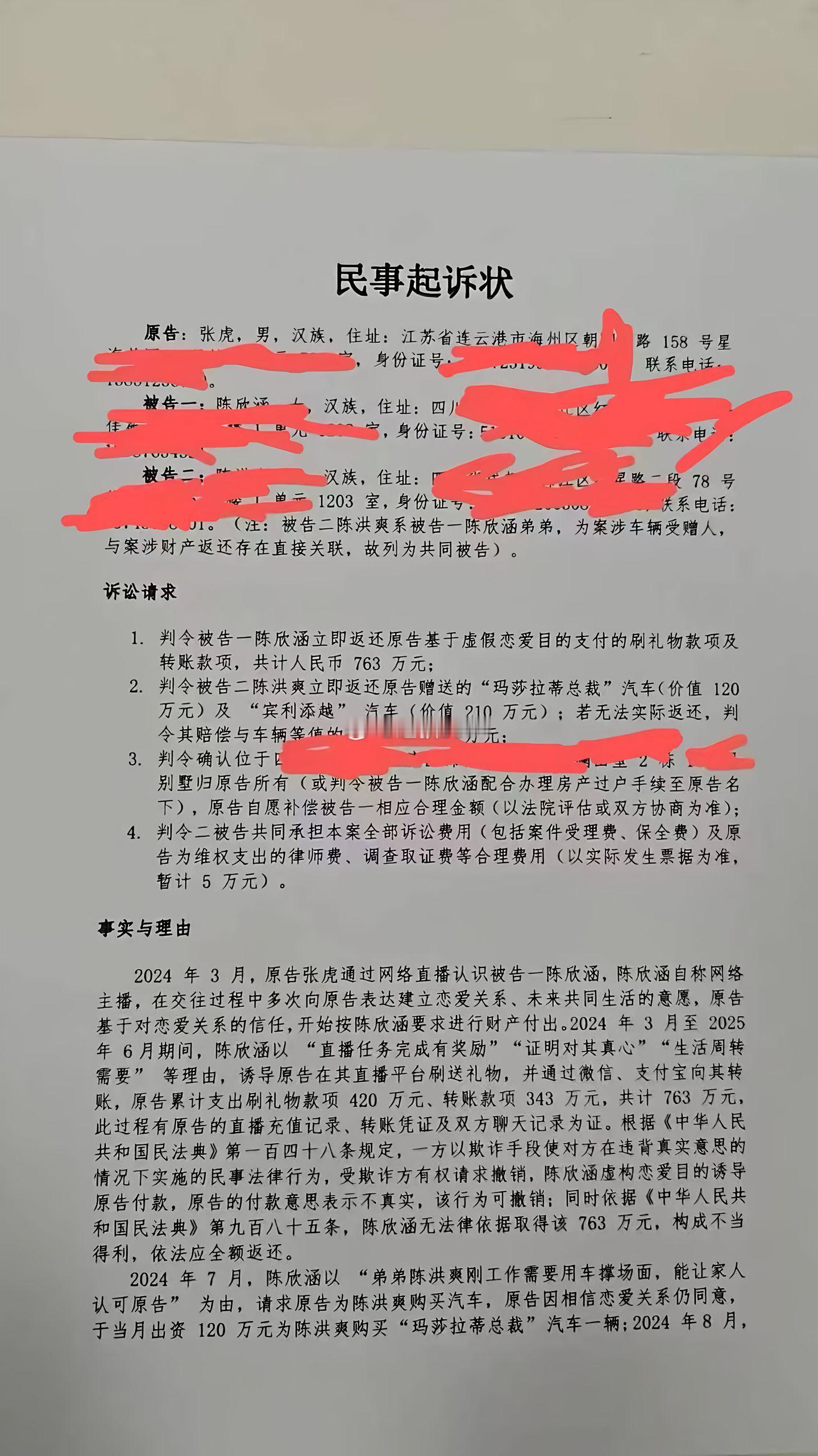 网友爆料,男子通过直播认识女主播(陈欣涵),在交往过程中多次向男子表达建立恋爱关系,在2025年6月期间,以“直播任务完成有奖励”“证明对其真心”“生活周转需要”等理由,诱导男子在直播平台刷送礼物,并通过微信、支付宝转账,累计763万元。目前以虚假恋爱为由起诉女主播返还全部费用。
