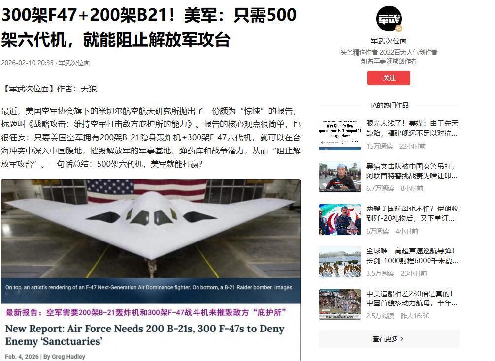 美国智库是不是不知道自己的F-47六代机还停在PPT阶段,连原型机都没影,跟中国两架已经试飞多次的六代机压根不在一个维度。 中国六代机相关技术早已落地测试,隐身、航电、无人协同全是实战化标准,各项性能拉满已成体系;而美国 F-47 还停留在纸面上,连原型机都没影,所谓洲际航程、大载荷和制空优势全靠嘴吹,说白了就是个画饼的概念机。 更可笑的是,美智库拿这款没影的战机说事,叫嚣要造300架组建部队,还扯着要突入中国内陆的幌子喊着加钱,小丑嘴脸暴露无遗。 明眼人都看得透,这哪里是为了应对所谓冲突,不过是借着渲染中国威胁,拿尚未成型的F-47当借口,向国会伸手薅军费,给军工复合体捞金找由头,满肚子的算计藏都藏不住!