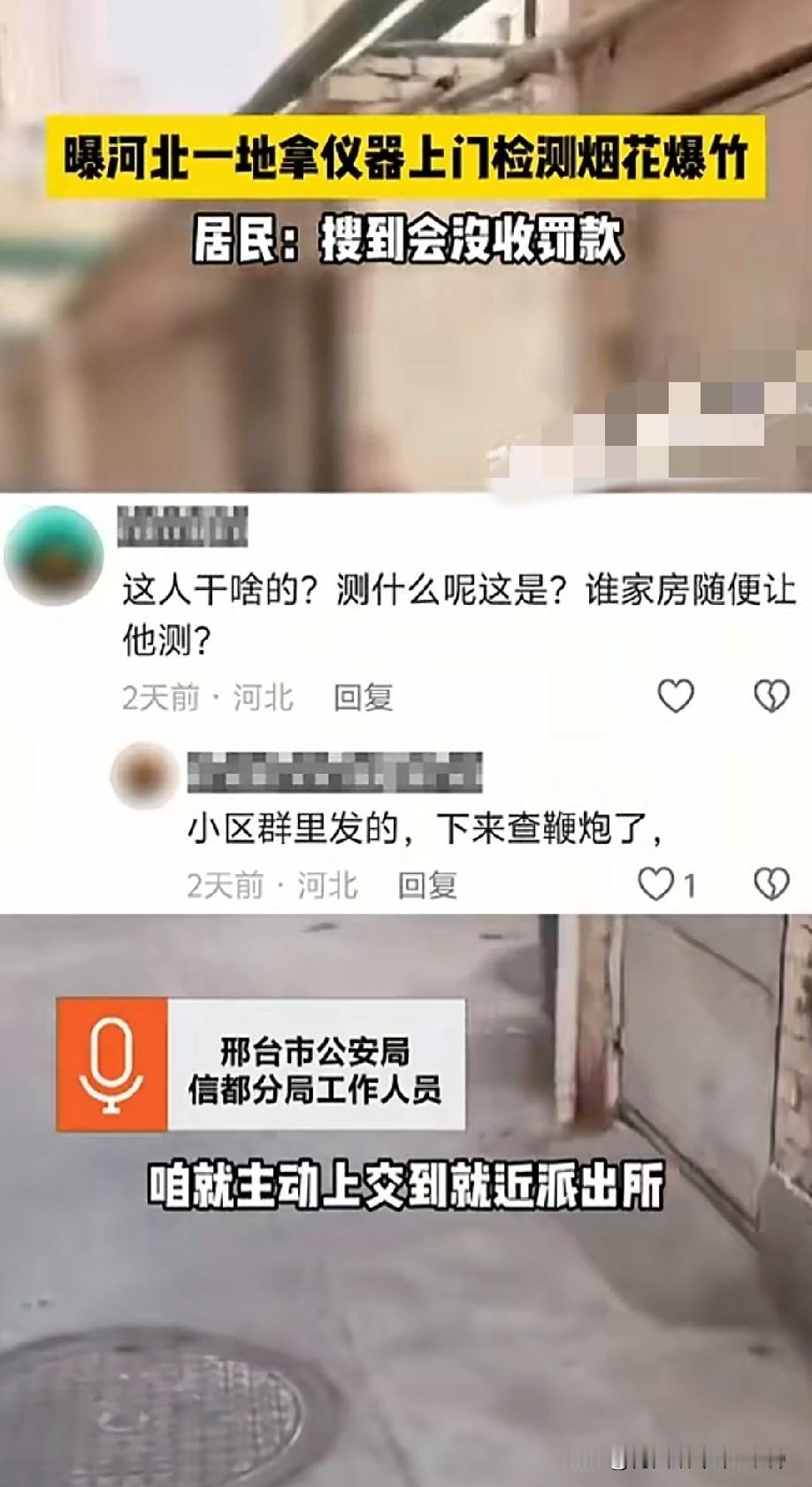 河北一地放大招:扛仪器上门查鞭炮,居民慌了! 河北邢台某地这波操作,把当地人整懵了——最近街上突然出现扛着探测仪的工作人员,挨家挨户排查烟花爆竹,只要搜出来,直接没收+罚款。 有村民拍了视频发在村群:“刚吃完午饭,就有人敲院门,说‘检测安全隐患’,那仪器在院里扫了一圈,连柴房都没放过。”一位大叔吐槽,自己藏在仓房的两挂鞭炮被搜走,还被罚了200块,“本来想三十晚上放的,现在只能看别人家热闹”。 邢台市公安局信都分局回应:这是春节前烟花爆竹安全排查,建议村民主动把鞭炮交到就近派出所。但乡亲们议论开了: “安全咱懂,可上门搜是不是太冒失?家里的东西哪能随便让人翻?” “集市上还在卖炮仗,转头就上门查,这前后不搭啊?” 其实河北多地春节前都在严管鞭炮,可直接扛仪器进家查的,还是头一回见。有大娘偷偷把鞭炮埋进了菜窖,“孩子盼着过年放炮,总不能让他空欢喜”;也有年轻人觉得“严点好”:“去年邻村放炮把草垛点着了,真出事就晚了。” 眼瞅着离春节越来越近,当地村民分成两派:有人急着处理家里的鞭炮,有人琢磨着“躲一躲”。只是这上门检测的方式,到底是“安全硬招”还是“操作越界”,不少人心里都打着问号。