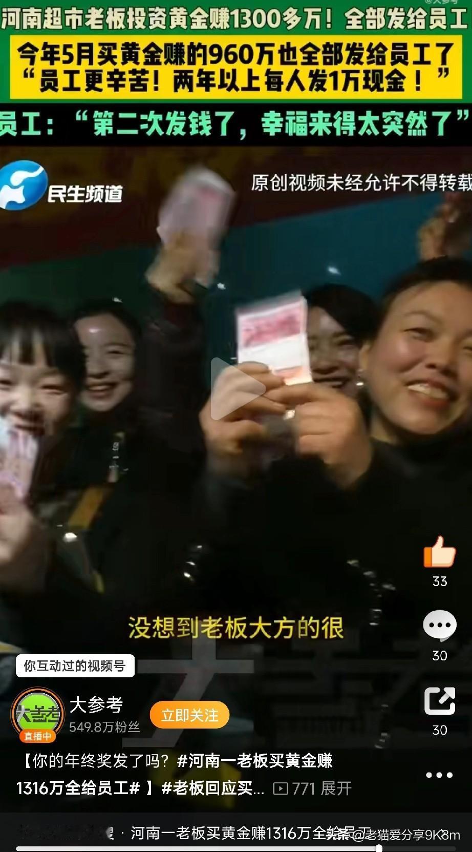 河南老板赚1316万全发员工:就想让大家开心过年! 今天刷到一条新闻直接让我