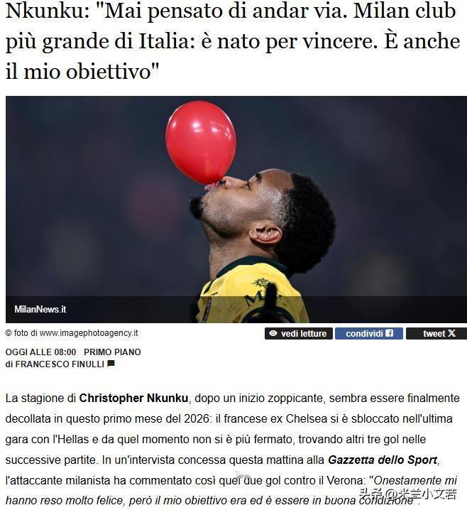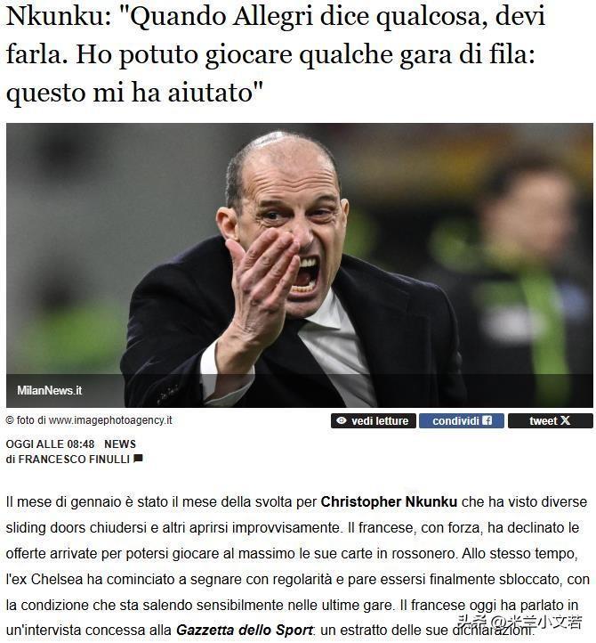 恩昆库!恩昆库接受采访表示我从未想过离开米兰,我之前确实遭遇了一些困难,但当你微笑、用更积极的方式看待困难,一切都会改变。我现在比刚来时好很多。对阵维罗纳梅开二度后,再加上因脚踝问题缺席了几场,我终于能连续首发,这对我帮助很大。 恩昆库告诉米兰球迷他现在感觉越来越好,他会在未来用良好的表现为球迷带来快乐。同时恩昆库表示我做出加盟米兰的决定只用了一分钟,当世界最伟大的球队之一对你发出邀请时,你无需考虑太多,我既然选择了米兰就会把最好的自己呈现给米兰,我从未想过离开,遇到困难需要的是解决困难,而不是逃避。 同时恩昆库谈到了他的队友,迈尼昂、拉比奥特与莫德里奇,恩昆库都给出了高度的评价。感觉恩昆库与看到的有点不一样,实话实说恩昆库加盟米兰肯定是开心的,但他的表现实在没办法让我们满意,他的拿球他的肋部突击在冬季窗口之前我们是没看到,现在?个人觉得他的肋部突击依然没看到,希望如恩昆库自己说的那样,连续首发后状态可以越来越好。