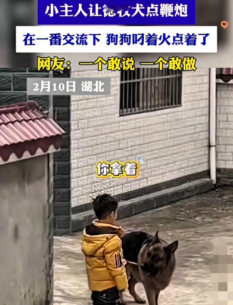 笑喷又暖心! 湖北这只狗狗直接成了全家“显眼包”,看完谁能不佩服! 小男孩想点鞭炮迎接爸爸,自己又害怕,居然对着狗狗比划、学狗叫“布置任务”,本以为只是小孩子瞎闹,没想到狗狗真的听懂了。 它叼起火棍,小心点着引线,点完立马撒腿就跑,一套动作行云流水,比小朋友还镇定。 家长夸孩子勇敢,孩子耿直一句“是狗狗点的”,调出监控全家都看呆了。 这哪是宠物啊,简直是陪小主人长大的最佳队友,怕归怕,活儿一点不耽误。 真正的默契根本不用语言,一个眼神、几声叫唤,彼此就懂了。 小动物给人的陪伴和忠诚,真的太治愈了。 你家毛孩子有没有过这种又聪明又讲义气的瞬间?