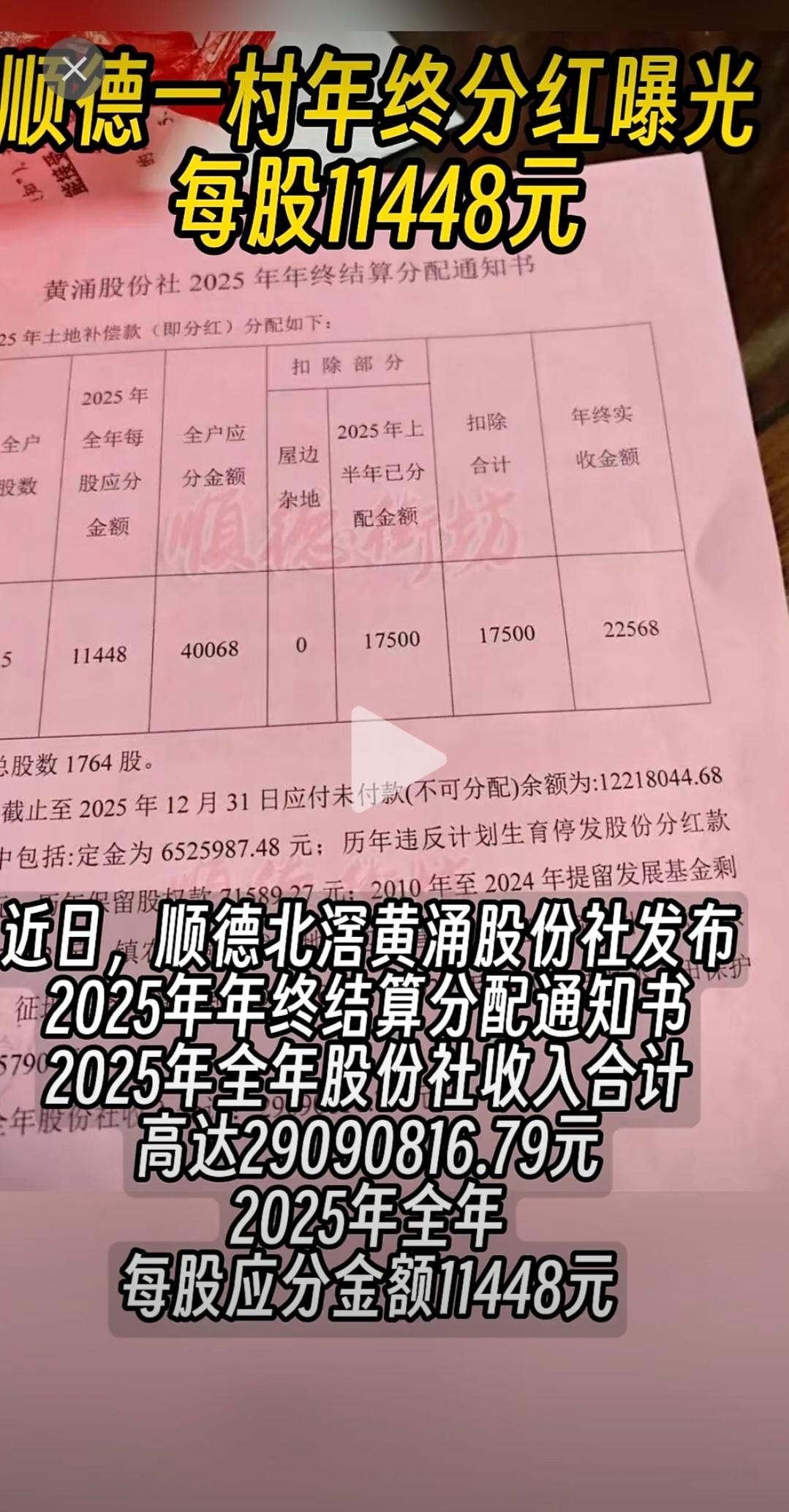 分钱啦!顺德北滘一个村的村民又分红了,大家不要眼红![呲牙]近日,佛山市顺德区北滘镇黄涌股份社发布2025年年终结算分配通知书:2025年全年股份社收入合计高达29090816.79元,2025年全年每股应分金额11448元!如果一家有五口人,那就有5万多,全年的基本生活费有了! 这个数字放在顺德村民,应该属于中等吧,还有很多比这个村民分红更多的。这样有分红的村,女儿可能外嫁户口都不想迁走,生了小孩户口都可能都纳入女方这个家庭。 我以前有个同事,他就是外省人,他找了一个太太是顺德本地人,然后他就当做上门女婿一样,自己的户口也纳入顺德这个村,生了两个小孩,也是留在原来这个村,都有享受分红。 这样一家人最基本的每年有一个稳定的收入,村里的宅基地自己自建房,所以他们的压力还是相对比较小。 所以人与人之间生来不可能是平等的,如果出生在广州猎德村,或者深圳某一个村,那完全分红数据就更不一样了!如果说出生在内地一些偏远的村,1分钱分红都没有。 所以每个人的起跑线是不一样的,当然,普通农村的孩子要改变命运,主要还是要去学习。通过知识走出农村,去改变命运,然后让自己的小孩变为城里人,虽然没有分红,但是最起码有不一样的学习、成长环境,父母的努力奋斗,为儿女创造更好的托举。 不过,这几年乡村振兴的进步,很多内地农村条件环境也得到改善,政府对农村居住环境下放了很多资金改造,最起码路硬化了;农田根基,政府出钱建的更好;农村的小溪、小河,防洪、灌溉工程修建的非常完善;大家也盖了两三层的小洋楼,幸福指数还是提升的。 现在内地很多县、乡也有一些企业,招商成功,很多农民工不用背井离乡,远离故土,来珠三角、长三角打工,在家门口也可以找到现在工资不低的工作,可以住在自己的小洋楼里面,又可以照顾老人小孩。反过来,现在珠三角、长三角就业感觉优势越来越不明显,普通农民工有时真的不用出门打工了!最起码不用出门受气[捂脸] 这真的是一个巨大进步! (图片来源网络。如有侵权,请联系删除)