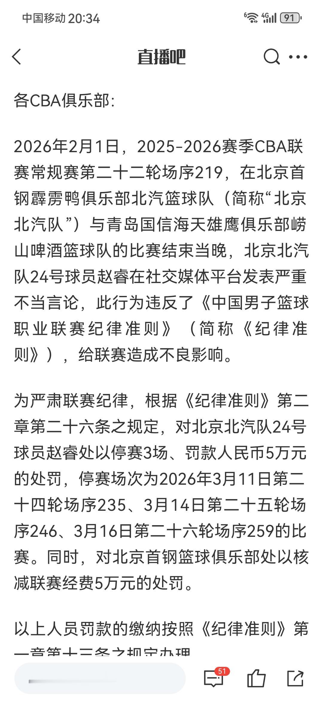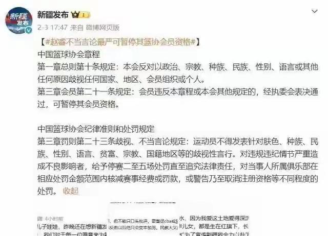 赵睿被罚咎由自取,没敬畏就是没有底线,没有敬畏肯定吃瘪 北京队输球那么多,谁指责赵睿和周琦,都不应该被支持,但周琦能闭嘴,赵睿还乱放炮,最终就咎由自取了,不能怪新疆政府方面开怼,在于一个党员球员,已经触及底线,CBA给停赛3场球,还罚款5万,都是按照章程走,事实上党纪处分都跑不了,因为CBA的党员不少,篮协方面不是法外之地。 赵睿就说两句话,但最短的涉及民族歧视,长的说是自由化敌对认知都不错,我都懒得把原话列出来,因为那样的话,等于替他张扬,还是希望借此给赵睿一个警醒:管不住嘴,就是没脑子,就不能学习一下周琦,踏踏实实打球,别尿得很高行吗? 那些无脑力挺的,事实上就是帮凶,不是提倡骂,而是要求赵睿夹紧尾巴,原则底线约束大家,傻子才被收拾,别以为都像勇士。