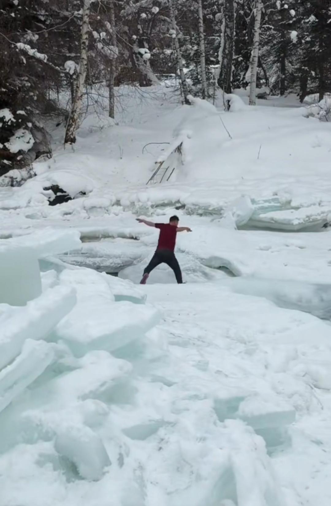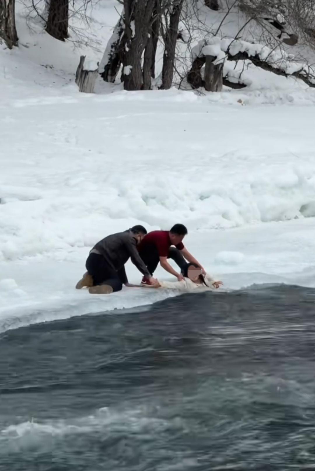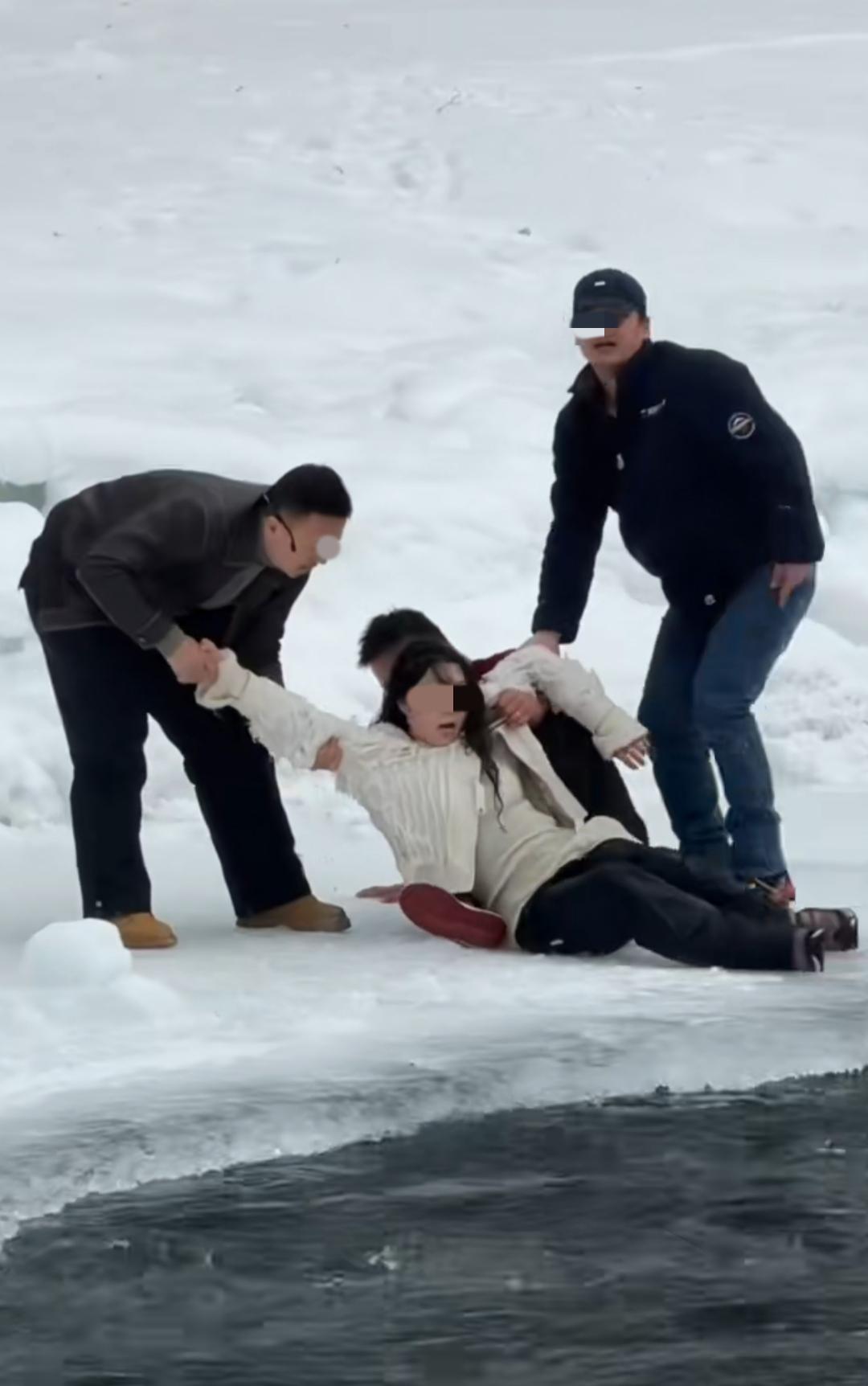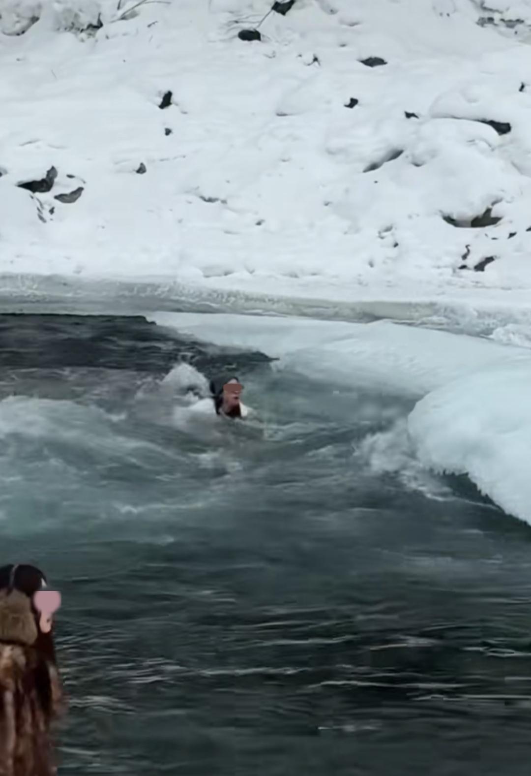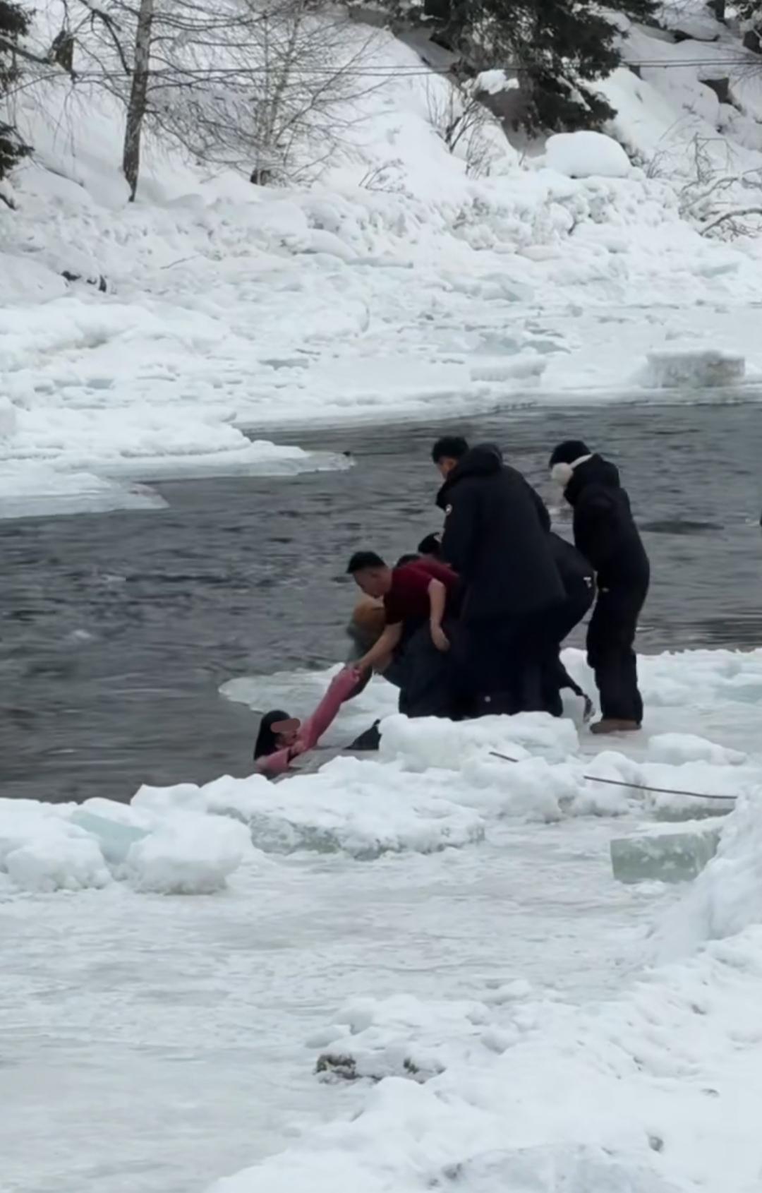近日,新疆喀纳斯花楸谷景区发生惊险一幕! 一对母女靠近河边拍照,突然女儿脚下一滑坠入河中,转瞬间就被冲走好远。 母亲救女心切,奋不顾身跳入冰河中,但是很快失去了控制。 好在她抓住河边一处凹陷的浮冰,被困在河水中。 岸边的几位男性游客纷纷展开施救,其中一位大哥脱掉棉衣,穿着短袖冲向河边。 他先和大家将小女孩救了上来,随后从河道狭窄处,跨越过去。 和其他人一起把妈妈又拉上岸。 母女俩有惊无险,最终都获救了。 提醒广大游客,拍照一定注意安全,冰河非常危险,坠入其中,会造成人体迅速失温,威胁生命安全。 热点大家聊 一对母女在喀纳斯景区坠入冰河