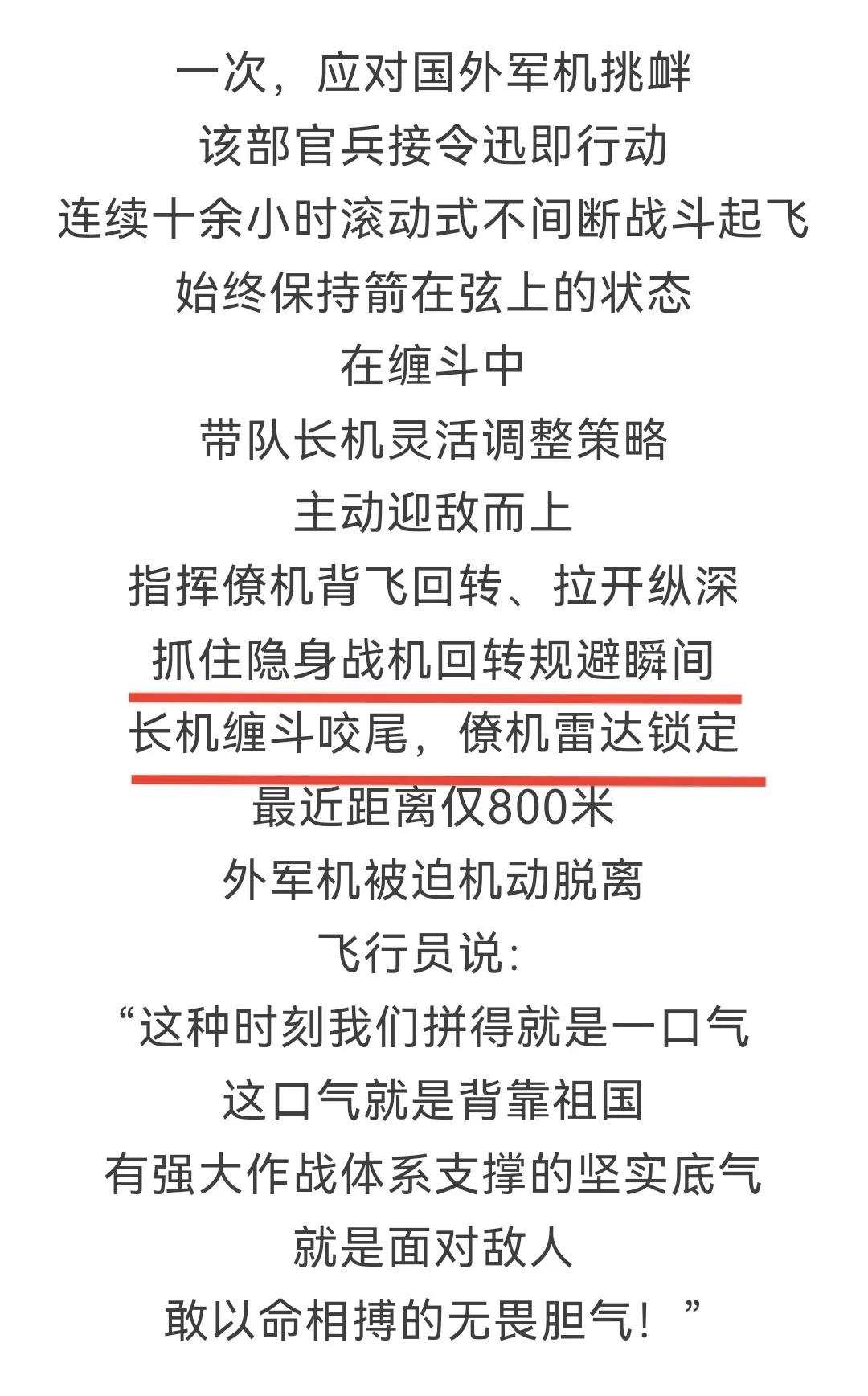 2月11日,据中国军网报道,解放军“海空雄鹰团”两架苏-30战机,在处置外军军机挑衅任务中,上演震撼空中较量。 飞行员连续十余小时滚动战斗起飞,长机灵活抢占阵位、贴身缠斗咬尾,指挥僚机背飞回转拉开纵深,抓住外机规避瞬间完成雷达锁定,最近距离仅800米,外军隐身战机被迫紧急机动脱离。 飞行员掷地有声:这种时刻,我们拼得就是一口气! 从公开细节判断,此次遭遇的外军隐身目标,极大概率为美军F-35系列战机,或从嘉手纳基地起飞的F-35A,或从两栖攻击舰起飞的F-35B。 我军四代机能精准截击、近身锁定五代隐身机,核心依托完整反隐身作战体系——地面远程预警与空中预警组网严密,即便F-35保持电磁静默,仍能被稳定追踪定位;相反,外机因静默状态,难以提前发现我机,被我双机编队从容接近、形成战术压制。 现代空战,从来不是单机比拼,而是体系对决。 近距格斗中,双机配合、战术优势远胜单一机型性能;F-35的机动能力,并不占优。 能发现、能跟踪、能锁定,就意味着能拦截、能驱离,必要时可果断击落。在我军完整空情预警与空战体系支撑下,不论是苏-30、歼-11、歼-10C还是歼-16,都有能力对F-22、F-35形成有效克制。 英雄部队亮剑海空,底气来自实力,忠诚守护祖国领空!