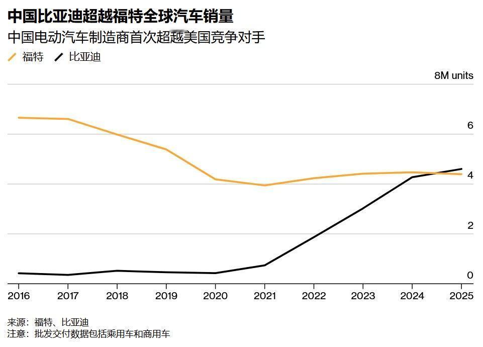 中国的比亚迪汽车2025年在全球销量上碾压了人类汽车业鼻祖之一的美国福特汽车,福特汽车去年的批发量下降了2%,降至接近440万辆,未能达到比亚迪汽车1月份报告的460万辆的汽车销量。据此,比亚迪已上升至全球销量排名第六位置,比福特领先了一个名次。 尽管福特汽车去年在美国的销量处于上升中,但是,在欧洲市场和中国市场却失去了大量的销售份额,尤其是中国市场,本土制造商鸿蒙智行(华为)、比亚迪、小米和吉利等车企凭借价格实惠、技术先进的电动汽车抢占了大量的市场份额,而包括福特和特斯拉在内的美国汽车品牌去年在欧洲市场也处于大溃败之中,原因既有政治的,也有贸易和技术上的。 与此同时,现在德国和日本传统汽车巨头在中国市场仍然可以撑起一片天空,并没有在中国新势力的崛起中全面失守,但美国汽车巨头在中国几乎可以算是完全被驱逐了,就像特朗普驱逐非法移民一样被市场工具驱逐。 美国传统的燃油车产品未来应该把市场重点放在美国,只有这一条出路。 其实这个结果还是挺公平的,福特汽车没有了中国市场,但比亚迪也没办法进入美国市场,这就是中美汽车产业的现状,美国汽车巨头们在特朗普政府“小院高墙”的贸易保护中得到喘息之机,一切慢慢来吧。
