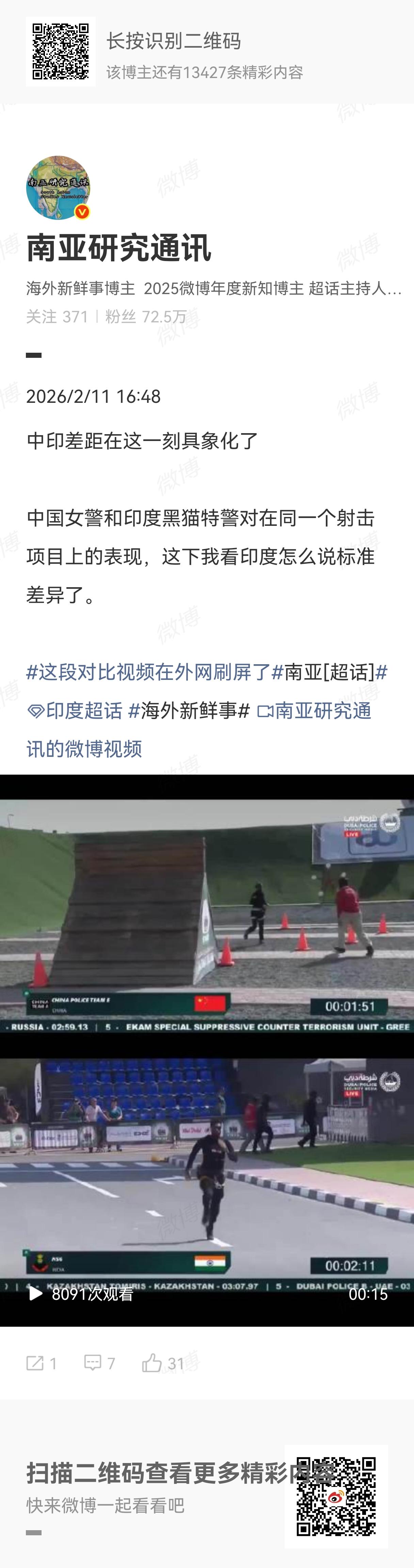 博主南亚通讯社在外网发了一个对比视频,是本次在迪拜参赛的中国女警和印度黑猫特警队在同一个射击项目上的表现,外网闹麻了,大家如果能上外网的可以去看看。而扎心的是,这支中国女特警队是本次六支队伍当中的第二女子队,实力比四川女子特警队稍微弱一点,但已经超过印度男队不是一丁点儿。而更扎心的是中国女子特警队实力同样比美国队强,但同样的对比视频在外网发不出去,被限流。