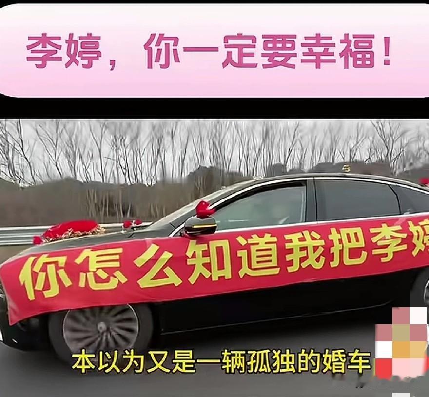 今年最让人破防、最感动的一场婚礼,没有浩浩荡荡的车队,没有隆重热闹的排场,只有一辆行驶在高速上、孤独却无比幸福的婚车。 车主特意挂出了一条长长的横幅,上面写着:“你怎么知道我娶到了李婷”。没有掩饰,没有低调,他恨不得让全世界都知道,他娶到了心爱的姑娘,这份藏不住的喜悦,直白又滚烫。 途中有过路司机好奇地摇下车窗问:就你一辆婚车吗?男生用力地点了点头,真诚又有点腼腆。这时,新娘也笑着探出头,跟陌生人挥手打招呼,干净又幸福。 谁也没想到,这一问一答,竟开启了全网最暖的一幕。路过的私家车、货车、网约车,看到这对简单又真诚的新人,不约而同地放慢车速,默默跟在婚车身后,一支由陌生人组成的“迎亲车队”,就这样自发集结,浩浩荡荡,护送他们奔赴往后余生。 没有约定,却无比整齐;互不相识,却满心祝福。原来最浪漫的婚礼从不是豪车成群、排场盛大,而是我满心欢喜娶你,是全世界陌生人都愿意为你让路、为你护航。 这一幕,真的看哭了无数人。愿这辆载满爱意与善意的婚车,一路向前,一生安稳,永远幸福!