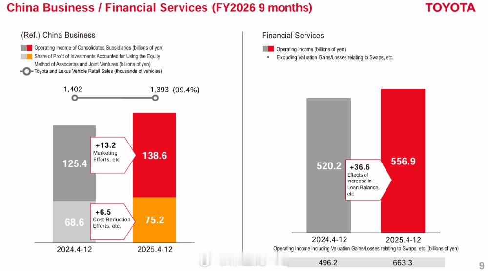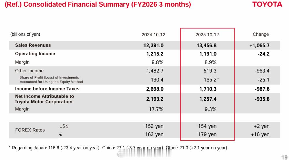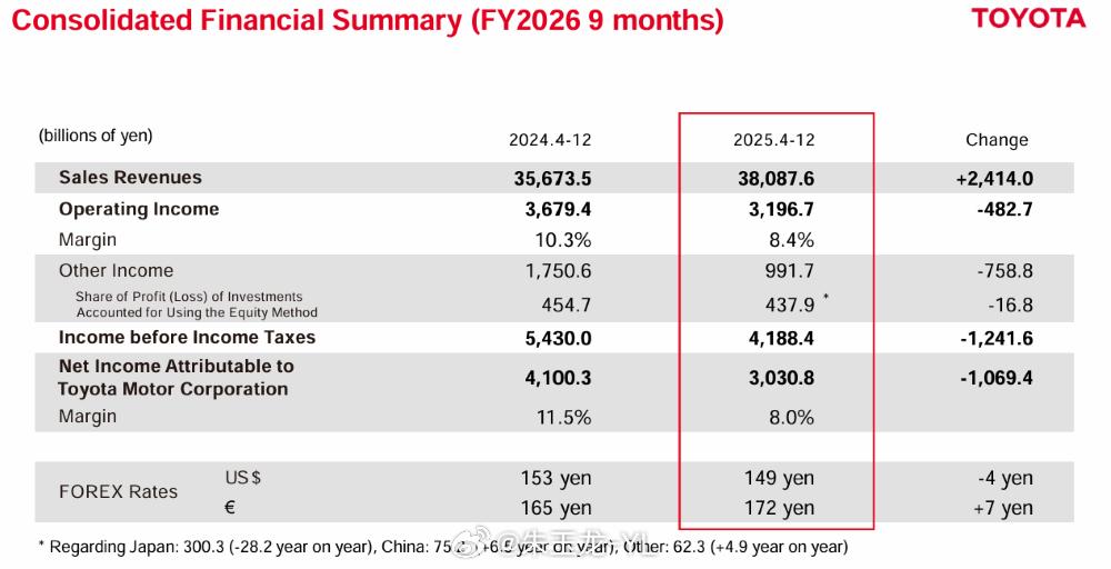 财年的前三季度(2025年4-12月),丰田营收38.09万亿日元,约合人民币1.72万亿元,同比增长6.8%;净利润3.03万亿日元,约合人民币1400亿元,同比下滑26.1%。