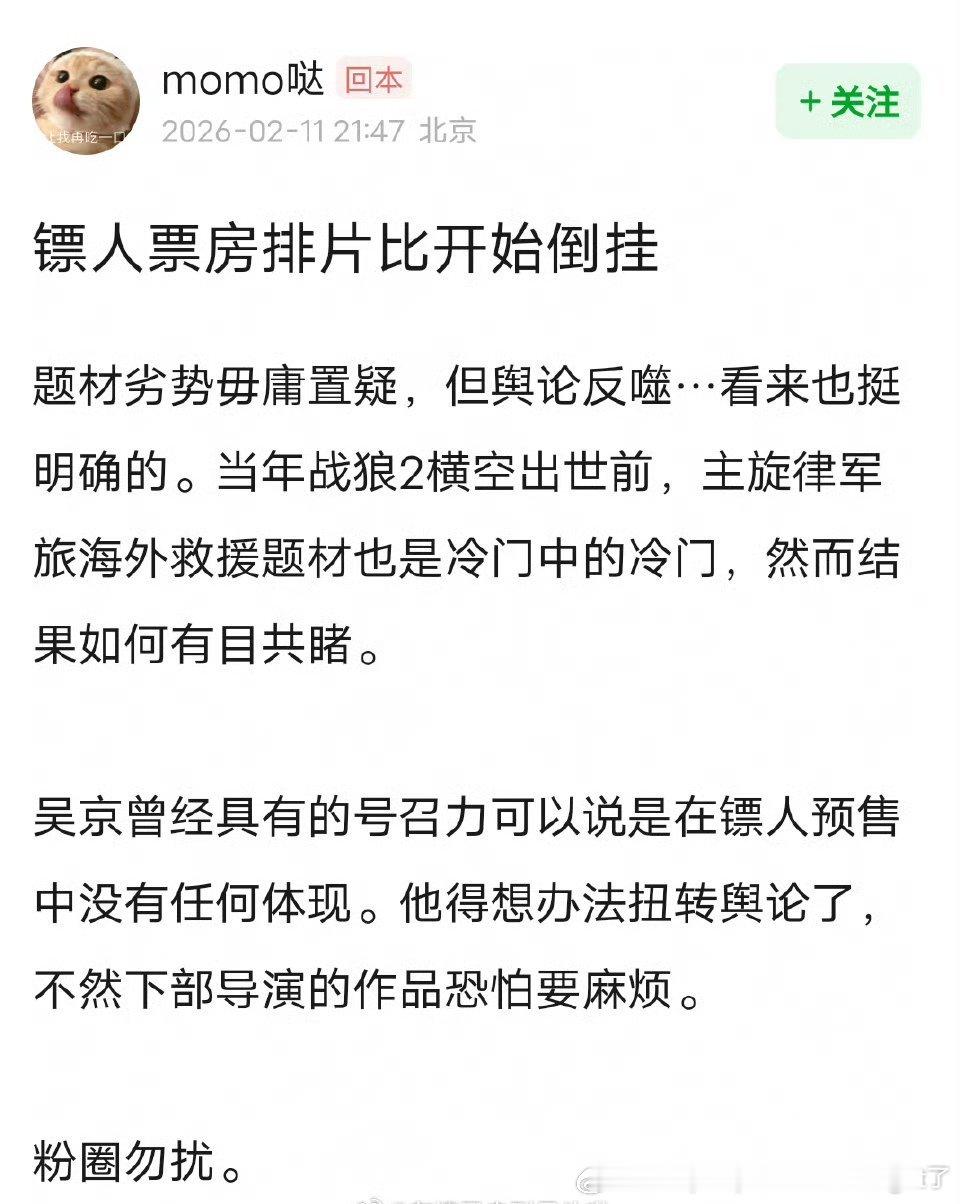 这种阵容只能拿16排片本来就很少了看吴师傅是“果然如此”还是逆袭了能不能来个追战狼2票房一样爽的?