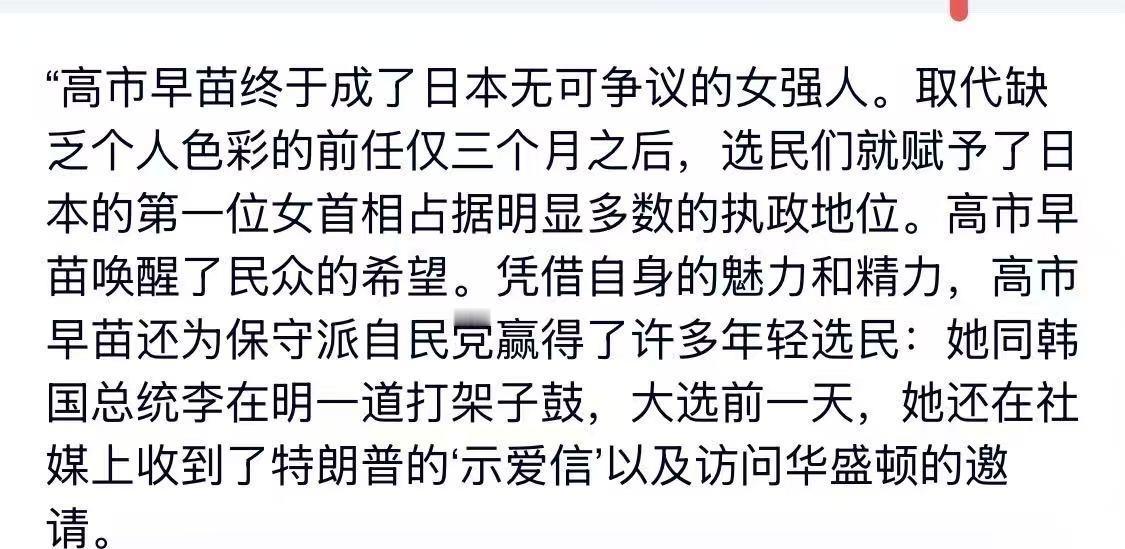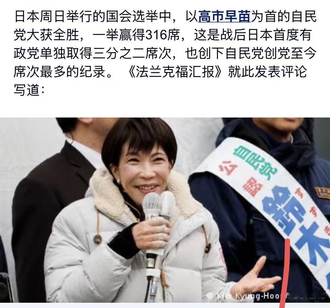 日本自民党在国会选举中大获全胜,说明日本进入了高市早苗时代,但是,不能说,时代造就了高市早苗,这个时代不需要高市早苗,因为四个月前,日本首相还是石破茂,高市早苗第一次当选也是勉强过关,得票率很低,没有太大威信和权威,四个月的执政,高市早苗在国际舞台丑态百出,国内经济社会也没有什么建树,所以说,高市早苗的成功,没有必然性,有很多偶然因素,这也决定了,如果环境改变,偶然因素又变了,高市自身不够优秀,很可能,很快就有危机。