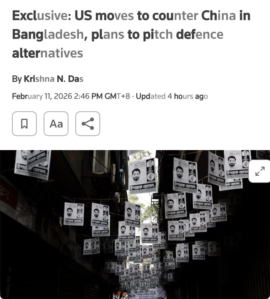 外媒:美国计划在孟加拉国大选后,向新政府推销美国及其盟友的国防系统,以抗衡中国在南亚日益增长的影响力。 美国驻孟加拉国大使表示,美国希望孟加拉国意识到与中国的某些合作可能带来的风险,并提供替代方案。 中国已与孟加拉国签署协议,计划在靠近印度边境的地方建造无人机工厂,还计划向巴基斯坦购买与中方联合开发的JF-17战斗机。美国希望孟加拉国与印度保持良好关系以维护地区稳定,并呼吁更多国际支持罗兴亚难民问题,称美国无法独自承担大部分负担。