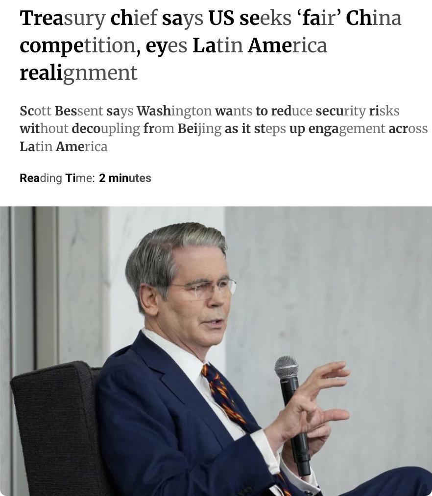 外媒:美国财政部长斯科特·贝森特表示,美国希望与中国进行公平且持久的竞争,并加强与拉丁美洲的经济和政治关系。 他强调华盛顿不想与中国切断经济联系,但希望减少在国家安全相关领域的风险暴露。贝森特提到关键矿产、半导体和制药行业是美国希望增强国内能力和供应链多样化的战略领域,并指出全球经济不能承受中国持续约1万亿美元的贸易顺差,暗示中国需要改变其增长模式。 此番言论发表在美国总统特朗普计划4月访华及中美高层即将举行会谈之前,旨在稳定两国商业关系。