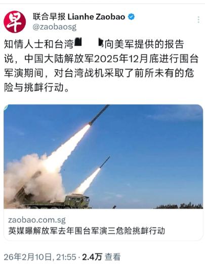 新加坡联合早报2月10日晚报道:“知情人士和台湾防务部门向美军提供的报告说,中国大陆解放军2025年12月底进行围台军演期间,对台湾战机采取了前所未有的危险与挑衅行动。”   解放军的围台军演根本不是什么 “挑衅”。国台办早就明确表态,世界上只有一个中国,大陆和台湾同属一个中国,这是不容篡改的历史和法理事实。   解放军搞军演,完全是针对 “台独” 分裂势力和外部势力干涉,目的是维护国家主权和领土完整,保护两岸同胞的共同利益。什么时候维护自己国家的主权成了 “挑衅”?这分明是民进党当局在颠倒黑白。   民进党当局之所以这么喊,最核心的目的就是向美国卖惨求军售。这些年他们一门心思搞 “台独”,知道自己没那个实力,就总想靠买美国的武器壮胆。   从台湾的预算数据就能看明白,2024 年度台当局防务部门的预算已经涨到了 4405.8 亿元新台币,其中军事投资就有 1305.6 亿元,比 2023 年增加了 34.65%。   更关键的是,台军有 18 项军购、商购计划马上要进入付款高峰期,2025 年 “一般装备” 的付款需求就超过千亿新台币,是 2024 年的 1.49 倍。   这么多钱要花出去,不给美国一个 “合理” 的理由怎么行?所以他们就编造 “解放军危险挑衅” 的说法,让美国觉得台湾 “处境危险”,从而顺利批准军售,让台湾民众的血汗钱源源不断流向美国军火商。   除了求军售,民进党当局就是想在岛内骗民意、转移矛盾。现在台湾的民生问题一大堆,老百姓日子过得并不轻松。   台湾早就快进入重度老龄化社会了,65 岁以上的长辈有 460 多万,占总人口快 20% 了,可他们每月平均生活费才 1.68 万新台币,不少七旬老人还得出去打工赚钱。   养老年金基金预计 2052 年就会破产,护理人员缺口高达 1.5 万到 2.4 万,医院过午都不开刀,养老院床位得排队 30 年才能住上。物价一个劲涨,菜价、房租、水电都在涨,可老百姓的工资却没见怎么涨,人均 GDP 看着挺高,实际获得感却很差。   这些民生问题民进党当局解决不了,就想出了炒作 “外部威胁” 的歪招。他们大肆宣扬 “解放军挑衅”,制造恐慌气氛,让台湾民众把注意力从民生困境转移到所谓 “安全问题” 上。   同时还在岛内大搞 “绿色恐怖”,打压不同意见,谁支持两岸统一、谁反对 “台独”,就给谁扣帽子。   他们就是想通过这种方式制造对立,让老百姓在恐慌中忘记他们的施政无能,骗取选票和支持。   民进党当局这套把戏看着热闹,其实危害极大。巨额的军购开支最终都得由台湾民众买单,防务预算一涨再涨,民生福利的钱就被挤少了,养老、医疗、教育这些和老百姓息息相关的事,他们根本没心思好好管。   而且这种炒作 “挑衅” 的行为,只会加剧台海紧张局势,让两岸关系越来越僵,最后倒霉的还是台湾民众。更让人不齿的是,民进党当局嘴上说着希望对话,行动上却不断挑衅,一边向美国求军售,一边在岛内搞分裂活动,完全是把台湾的命运绑在 “台独” 的战车上。   国台办早就说得很清楚,坚持一个中国原则,两岸关系就能改善发展,台海就和平稳定;背离一个中国原则,台海形势就会紧张动荡,台湾民众的利益就会受损。   “台独” 分裂是台海和平稳定的最大威胁,民进党当局的这些行径,本质上就是为了谋 “独” 私利,不惜牺牲台湾民众的利益和台海的和平稳定。   其实台湾民众心里都清楚,和平稳定才是好日子的根本。民进党当局炒作 “解放军挑衅” 的谎言,骗不了真正关心台湾未来的人。   他们求军售、骗民意的老把戏,只会让越来越多的台湾民众看清他们的真面目。两岸同属一中,统一是历史大势,任何分裂国家的行径,最终都会遭到失败,民进党当局也终将为他们的所作所为付出代价。