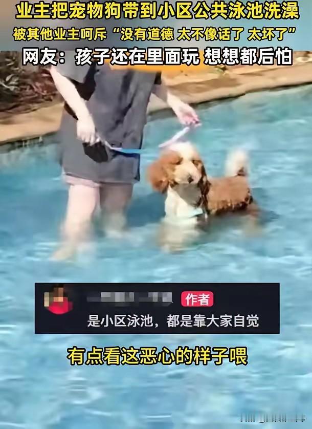 “太不像话了!”安徽,一男子到小区游泳池游泳,却发现一名女业主竟然把自家的宠物狗也带进泳池,虽然牵着绳,却在公共的泳池里面给狗狗洗澡,男子看后大怒:当场斥责她:太坏了! 公共泳池本是全体业主共享的休闲场所,安徽一小区内发生的一幕,却让在场居民倍感愤怒,也引发了网友对公共文明与规则意识的热议。 2026年2月8日下午,安徽某小区的室外泳池正常开放,不少业主趁着晴好天气前来游泳消暑,池内还有孩童在家长陪同下戏水玩耍,现场秩序原本平和有序。 一名男子换好装备准备入水游泳时,目光被泳池内的异常景象吸引,随即怒火涌上心头。 一名女性业主牵着自家宠物犬进入泳池区域,尽管用牵引绳拴着狗狗,却完全无视公共泳池禁止宠物入内的明确规定,径直带着狗狗踏入泳池水中,将这片供人游泳的水域当成了自家宠物的洗浴空间。 女子在水中不断拨弄池水冲洗狗狗的身体,动作随意且自然,仿佛身边没有其他业主存在,狗狗的毛发、皮屑随之漂浮在水面上,原本清澈的池水很快出现明显污渍,卫生状况急剧下降。 在场业主看到这一幕都感到十分不适,尤其是带着孩子的家长,立刻将孩子带离泳池边缘,担心水质污染影响孩子健康。 这名准备游泳的男子无法接受公共泳池被如此糟蹋,当场上前表达强烈不满,用严肃的态度制止女子的行为,周围陆续有业主围拢过来,纷纷对女子的做法表示谴责。 女子的行为不仅破坏了泳池卫生,更侵犯了全体业主的公共权益,让原本舒适的游泳环境变得无法使用。 小区泳池的管理规定中明确标注,禁止携带任何宠物进入泳池区域,更不允许在池内清洗宠物、杂物等物品,现场也设有醒目的提示标识,女子并非不知情,却依旧我行我素。 事发后,物业工作人员迅速赶到现场处理,将女子与宠物犬劝离泳池,并对池水进行紧急排空、消毒与重新注水,避免其他业主使用受污染的水源。 这段现场画面被传到网上后,迅速引发大量网友关注,大家几乎一致指责女子缺乏公共意识,为了一己之便无视公共规则,把个人喜好凌驾于他人权益之上。 网友们表示,爱护宠物可以理解,但不能以损害公共环境、影响他人生活为代价,公共空间需要每个人共同维护,任何个人行为都不能突破规则与文明的底线。 从现场愤怒的斥责,到物业及时的处置,再到网络上的广泛讨论,这起事件不仅暴露了个别居民规则意识的缺失,也再次提醒所有人,文明素养体现在公共场所的每一个细节里,守住规则边界,才能守护好大家共同的生活环境。 对此,你们有什么看法,欢迎评论留言~