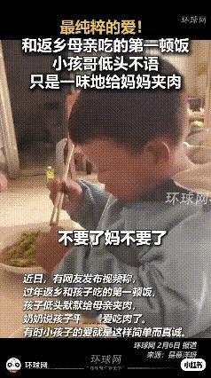 泪目!近日,一位年轻母亲外出务工返乡后,和一年没见的孩子一起吃饭,4岁儿子不说话,只一味地低头把自己碗里的肉全都夹给妈妈,并表示自己只喜欢吃菜。妈妈很疑惑,以为孩子不爱吃肉。问过奶奶才知道,孩子平时最爱吃肉了。妈妈这才懂,原来孩子在学着大人的方式,爱她! 近日,一段普通的家庭聚餐画面,让无数网友看完瞬间破防,藏在饭菜里的爱,远比任何语言都更戳心。 2026年春节前夕,一位在外奔波务工一年的年轻母亲,终于踏上返乡的路程,与留守在家、整整一年未曾见面的4岁儿子重逢。 久别重逢的母子俩,没有想象中激烈的拥抱与哭闹,孩子只是安静地依偎在母亲身边,眼神里满是想念,却又带着一丝久别后的生疏。 回家后的第一顿正餐,家人特意准备了丰盛的饭菜,桌上摆满了平时孩子爱吃的肉食,想给久未归家的母子好好补一补。 落座吃饭时,孩子全程低着头,安安静静地扒拉着碗里的饭菜,没有过多言语,也没有像其他同龄孩子一样争抢肉食,只是默默地用筷子把自己碗里的肉块,一块又一块全部夹到母亲的碗里,动作认真又执着。 母亲看着眼前乖巧的孩子,心里既温暖又疑惑,她以为孩子是不喜欢吃肉,才会把所有肉都夹给自己,便反复让孩子自己多吃一点,可孩子依旧坚持把肉留给母亲,还明确表示自己只喜欢吃青菜。 母亲看着碗里堆起来的肉块,心里满是复杂的情绪,既感动于孩子的懂事,又隐隐觉得事情并非表面那样简单。 饭后她带着这份疑惑,向孩子的奶奶询问平时孩子的饮食习惯,这才得知了让她瞬间泪目的真相。 原来,这个只有4岁的孩子,平日里最爱的食物就是肉食,每次家里做肉都会吃得格外开心,从来没有出现过不爱吃肉的情况。 得知真相的那一刻,母亲再也控制不住情绪,眼泪瞬间夺眶而出,她终于明白,孩子并不是不喜欢吃肉,而是在用自己最纯粹、最稚嫩的方式爱着她。 在孩子小小的世界里,最好的东西都要留给最想念的妈妈,他学着平日里大人照顾他的模样,把自己最珍爱的食物全部奉献出来,用最简单直接的举动,表达积攒了整整一年的思念与爱意。 孩子不懂华丽的表达,也说不出动人的情话,却把所有的偏爱都给了久别归来的妈妈,一块一块夹过去的不只是肉,而是一个孩童能给出的全部温柔。 这段没有任何修饰的日常画面,被家人随手记录下来发到网上,迅速触动了无数在外打拼父母的心,大家从孩子的举动里,看到了最干净、最纯粹的亲情,也读懂了留守儿童藏在沉默里的深情。 没有惊天动地的故事,没有刻意煽情的台词,只是一顿普通的晚饭,只是一个小小的夹菜动作,却道尽了母子之间最深的牵挂,也让所有人看到,爱从来都不需要教,孩子会用自己的方式,悄悄爱着为他奔波的人。 对此,你们有什么看法,欢迎评论留言~