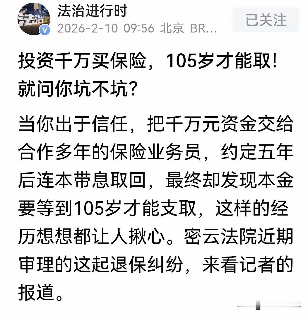 太坑了,差点倾家荡产!北京,男子出于信任,将1000多万的资金,交给合作多年的保险业务员打理。双方交流时,男子再三称,这是公司周转的钱,并约定5年连本带利取回。当男子查看保险合同时,猛然发现,本金要等到他105岁才能取出,男子顿时懵了,马上提出退保,保险公司立马翻脸拒绝。 千万资金托付给熟人打理,本以为是稳妥的短期理财,最后却发现本金要等到105岁才能取出,北京一名男子遭遇的保险陷阱,让他险些陷入倾家荡产的绝境。 家住北京的李先生经营着自己的生意,手头有一笔用于公司周转的大额资金,出于多年合作建立的信任,他将这笔总计超千万元的款项,交给相熟的保险业务员进行理财规划。 沟通期间,李先生反复明确告知,这笔钱是企业经营的周转资金,流动性要求极高,双方口头约定产品期限为五年,到期后可以连本带利全额取回,正是基于这样的约定,李先生才放心地完成了投保流程。 由于对业务员极度信任,加上合同文本长达数十页、充斥着大量专业术语,李先生没有逐字逐句仔细核对条款,在业务员的引导下完成签字,随后按约定缴纳了足额保费。 一段时间后,李先生偶然翻看这份保险合同,在条款中看到了让他浑身发凉的内容,合同明确标注, 这笔千万本金的领取条件是投保人年满105周岁,五年期满后只能领取极少比例的红利,根本无法取回本金,这与当初约定的五年到期兑付完全相悖。 得知真相的李先生瞬间懵掉,这笔钱关系到公司的正常运营,一旦无法按时回笼,整个生意都会陷入停滞,甚至面临倒闭风险。 他第一时间联系保险公司,提出退保并要求返还全部保费,同时赔偿相应的利息损失,可保险公司的态度瞬间转变,直接拒绝了他的退保申请,以合同已生效、条款明确为由,拒不退还保费。 多年的信任在利益面前荡然无存,一边是公司资金链紧绷的压力,一边是保险公司的强硬拒绝,李先生陷入了进退两难的境地,精神和经济都承受着巨大压力。 多次协商沟通均无果后,李先生没有选择妥协,而是将这家保险公司起诉至法院,请求法院依法撤销这份保险合同,判令对方返还全部保费,并承担资金占用期间的利息损失。 法院在审理过程中,全面梳理了双方的沟通记录、合同条款、资金往来凭证等证据,查明业务员在明知李先生的资金用途和兑付需求的情况下, 故意隐瞒105岁才能取回本金的核心条款,利用投保人的信任和专业信息差,诱导其签订不符合真实意愿的合同,该行为已经构成欺诈。 法院同时认定,普通消费者面对冗长复杂的保险合同,难以独立识别全部风险条款,保险公司未履行充分的提示和说明义务,合同签订并非李先生的真实意思表示。 最终法院作出判决,撤销涉案保险合同,要求保险公司向李先生返还全部已缴保费,并支付相应的利息损失,用公正的判决为李先生守住了辛苦打拼的资产,也让恶意误导销售的机构承担了应有的责任。 一场由信任引发的财产危机,在法律的公正裁决下得以化解,千万资金险些有去无回的经历,也给所有进行金融理财的人敲响了警钟,书面合同的每一项条款,都远比口头承诺更值得重视。 对此,你们有什么看法,欢迎评论留言~