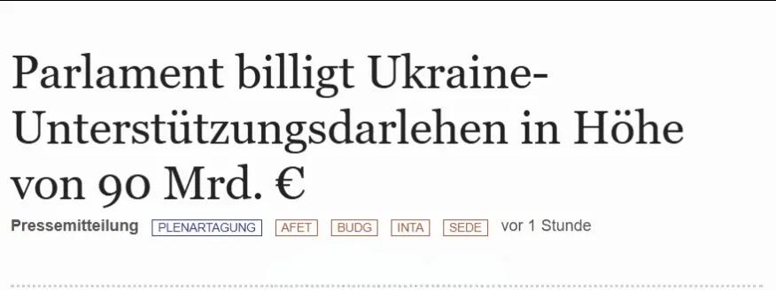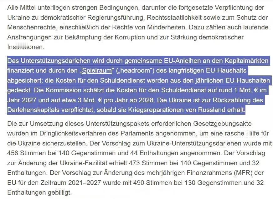 欧洲议会今天正式批准了欧盟向乌克兰提供900亿欧元贷款的计划。既然是贷款,当然是要乌克兰还的,2027年利息为10亿欧元,2028年后每年利息30亿欧元。至于贷款本金,乌克兰政府可在“获得俄罗斯战争赔款”后偿还。 所谓用俄罗斯的赔款还本,是欧盟哄各成员国老百姓的,总不能直说这笔巨额贷款是肉包子打狗吧。欧盟除非没收扣押的俄罗斯海外资金,否则是不可能等到俄罗斯给乌克兰赔款,然后乌克兰再还欧盟贷款本金的。乌克兰都要把60岁以上的人送到战场上了,还指望乌克兰打败俄罗斯,从俄罗斯拿到赔款,这脑洞未免开的太大了。#欧洲对乌援助#