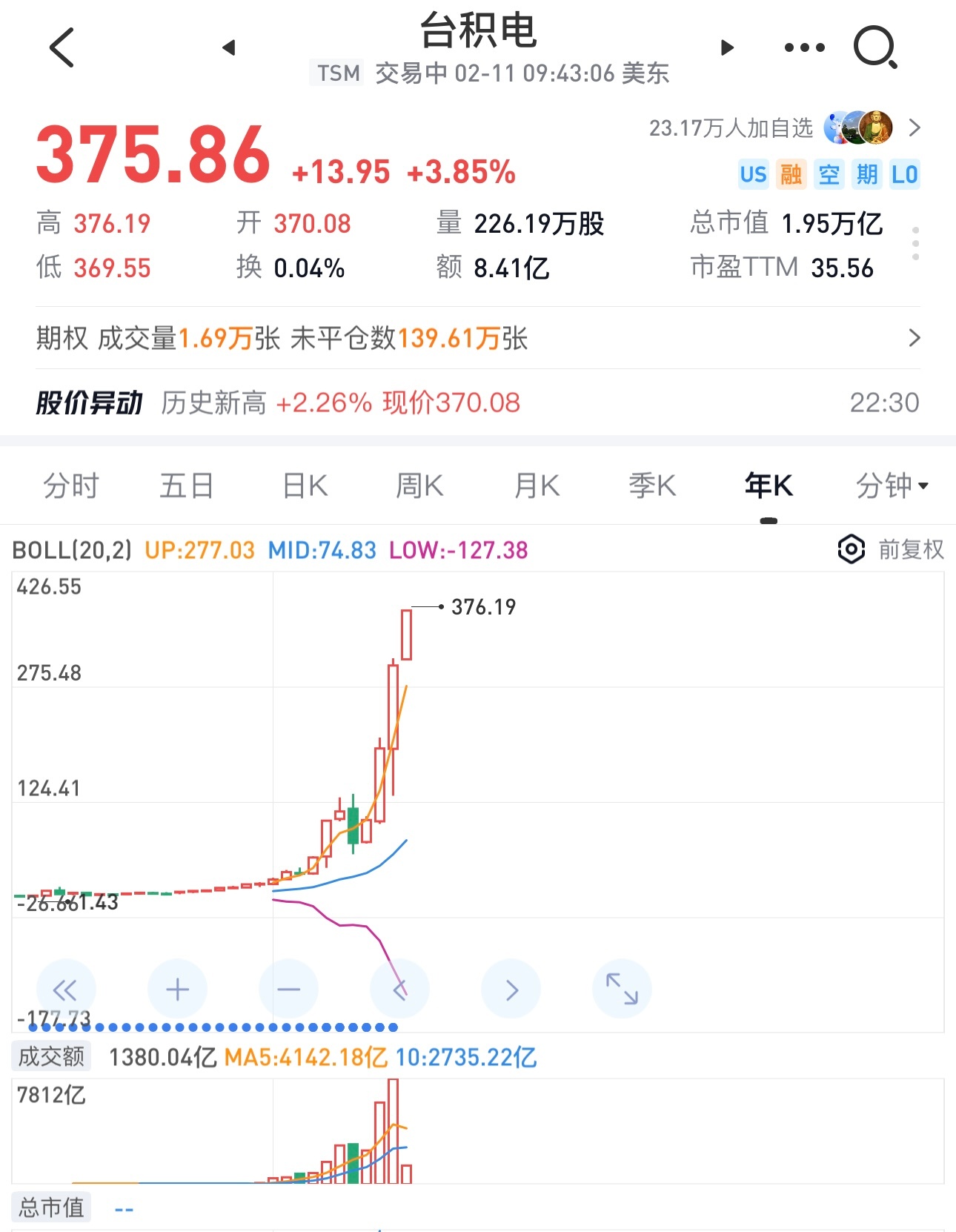 台积电股价今晚再创历史新高,利好A股的国之重器,对它要市值重估。台积电都1.95万亿美元了。