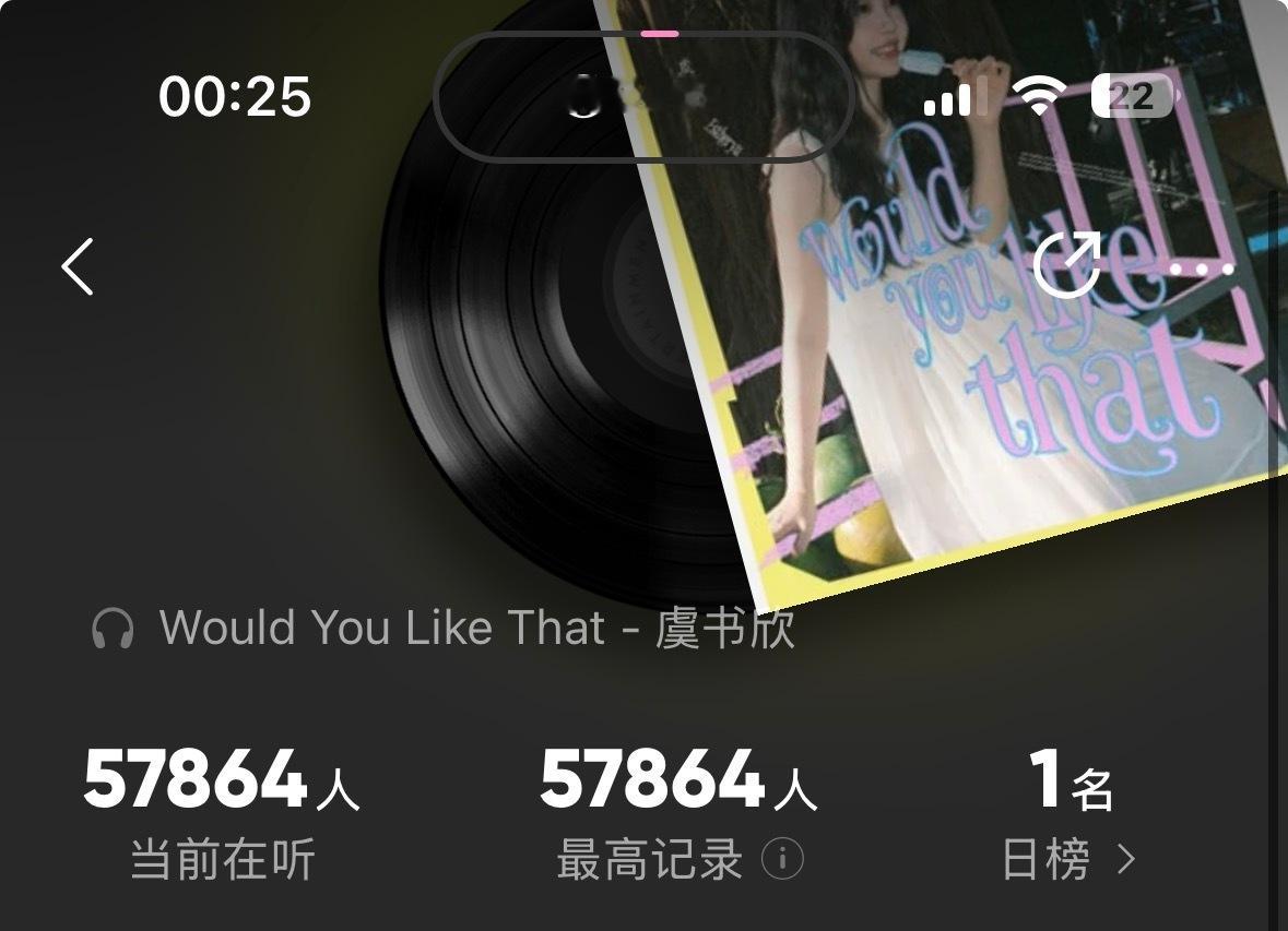 虞书欣新歌WouldYouLikeThat在线人数5万7日榜第一☝️