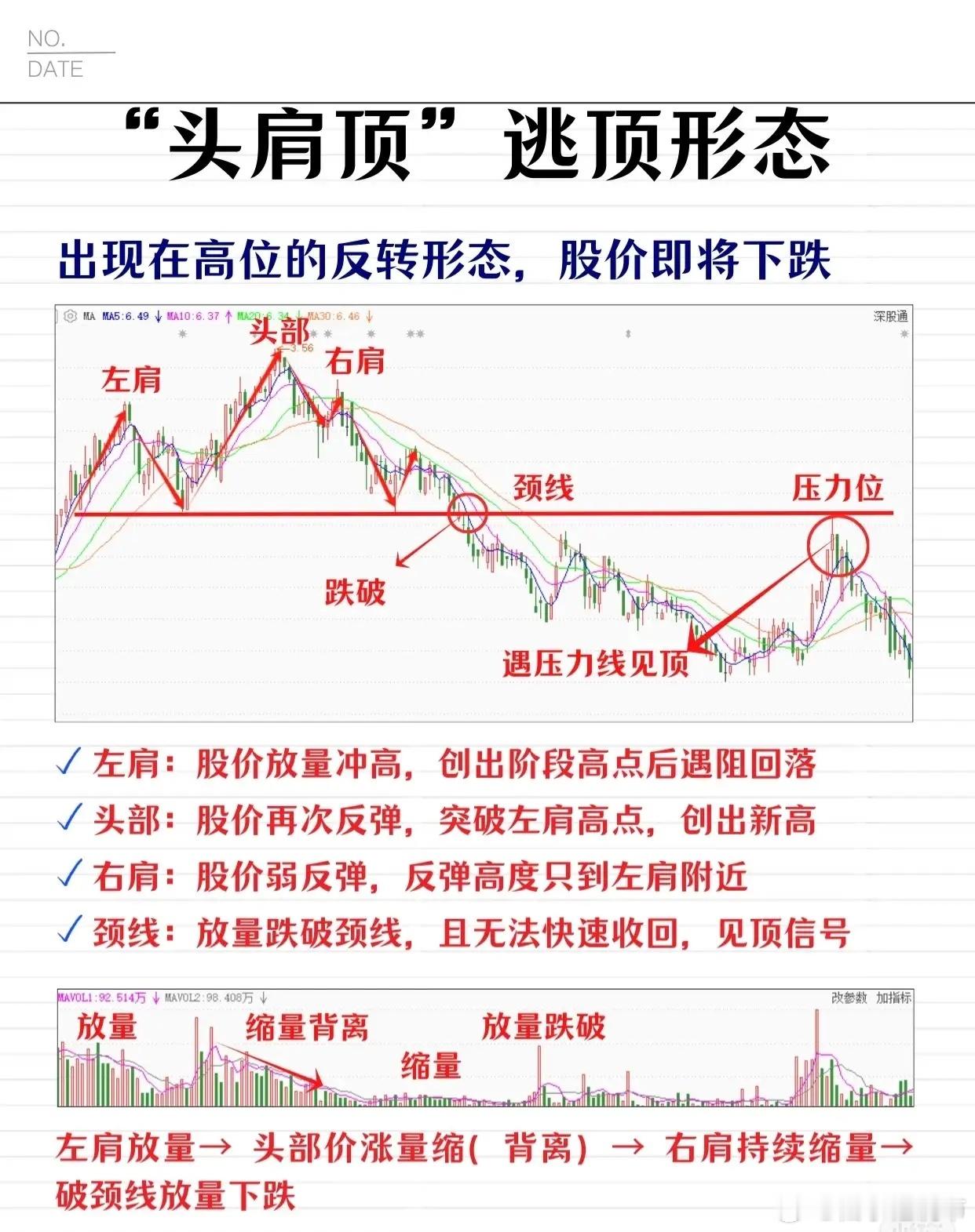 “头肩顶”是高位反转形态,预示股价将下跌。特征为:左肩放量冲高回落;头部反弹创新高;右肩弱反弹至左肩附近;放量跌破颈线且难收回为见顶信号。量能上呈现左肩放量、头部价涨量缩(背离)、右肩持续缩量、破颈线放量下跌的变化。