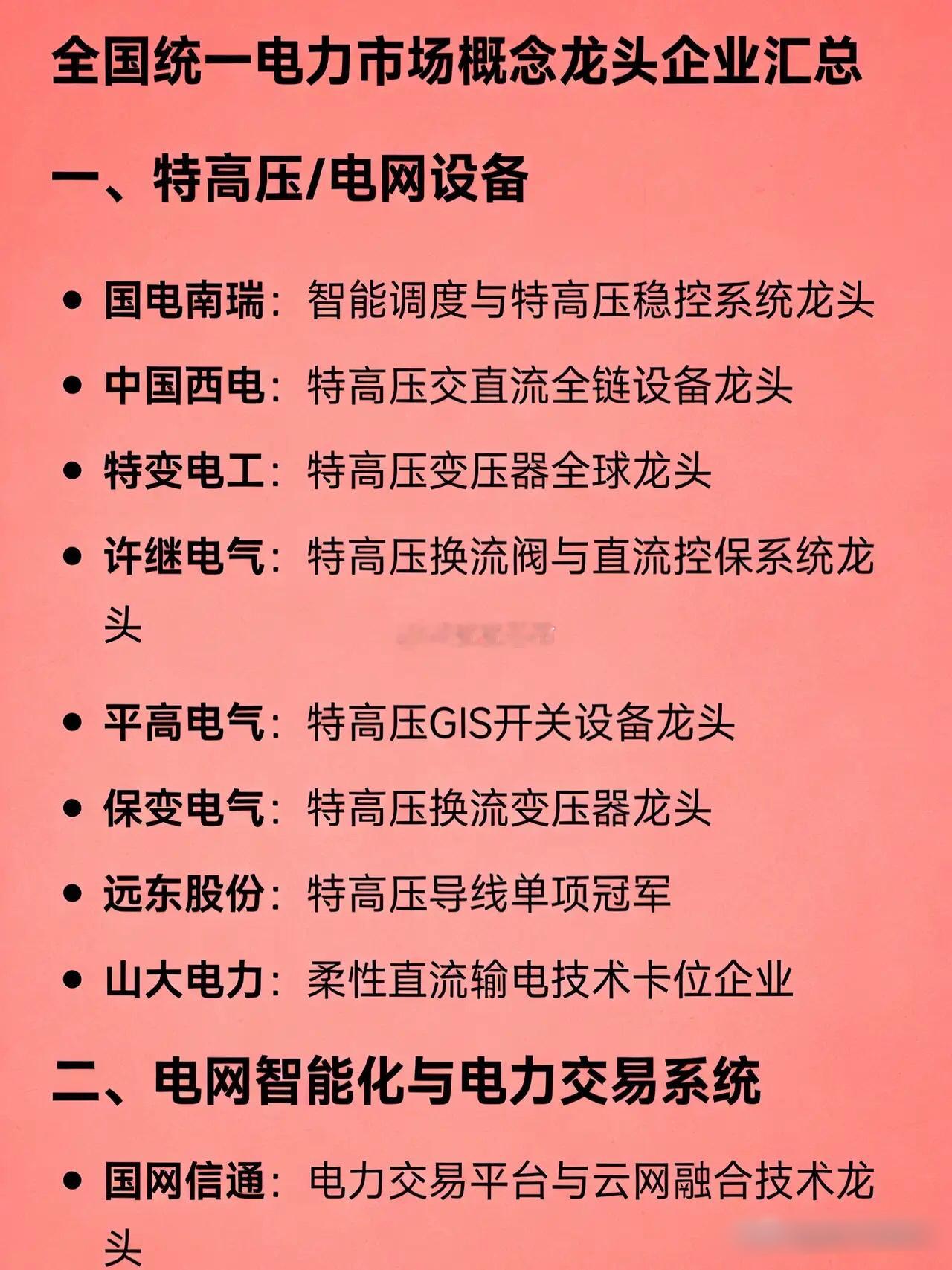 一、特高压/电网设备 - 国电南瑞:智能调度与特高压稳控系统龙头 - 中国西电:特高压交直流全链设备龙头 - 特变电工:特高压变压器全球龙头 - 许继电气:特高压换流阀与直流控保系统龙头 - 平高电气:特高压GIS开关设备龙头 - 保变电气:特高压换流变压器龙头 - 远东股份:特高压导线单项冠军 - 山大电力:柔性直流输电技术卡位企业