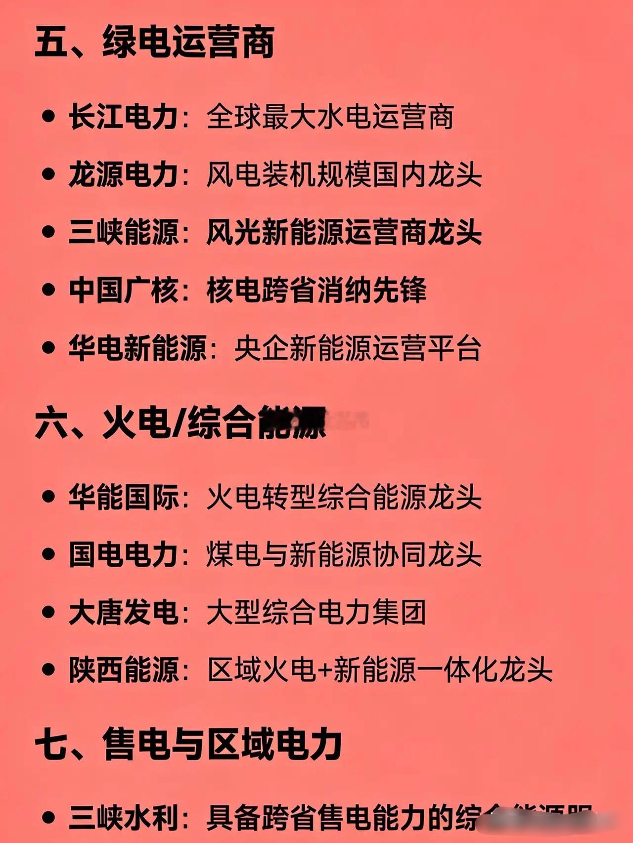 七、售电与区域电力 - 三峡水利:具备跨省售电能力的综合能源服务商 - 广州发展:华南区域能源与售电龙头 - 明星电力 / 桂东电力 / 广安爱众:地方电网+售电一体化代表