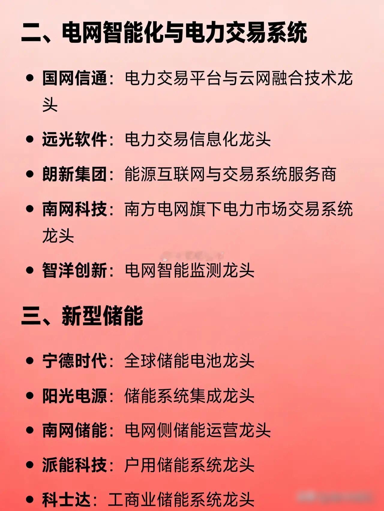 二、电网智能化与电力交易系统 - 国网信通:电力交易平台与云网融合技术龙头 - 远光软件:电力交易信息化龙头 - 朗新集团:能源互联网与交易系统服务商 - 南网科技:南方电网旗下电力市场交易系统龙头 - 智洋创新:电网智能监测龙头