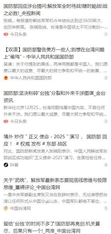 汹涌的民意恐怕就压不住了,国防部发言人说的,我们已经保持了最大的克制,可不是在开玩笑的!自古以来参军除了保家卫国,那就是想建功立业了,不想当将军的士兵,不是好士兵! 麻烦看官老爷们右上角点击一下“关注”,既方便您进行讨论和分享,又能给您带来不一样的参与感,感谢您的支持!   近期台海局势持续升温,两岸关系处在十分敏感的节点。民进党当局不断推进 “台独” 分裂活动,频频挑衅大陆底线,同时外部势力不断插手台海,让本就复杂的局势更加紧张。面对接连不断的试探与施压,大陆不再单纯被动应对,而是打出军事、法律、外交、经济一整套组合拳,主动掌握台海局势主导权。   国防部多次就台湾问题公开发声,明确表示中方已经保持了最大限度的克制,这不是外交辞令,而是基于维护和平的真诚态度。官方多次强调,我们始终愿意以最大诚意、尽最大努力争取和平统一前景,克制的背后是对台海稳定的珍视,也是对两岸同胞生命财产安全的负责。   这种克制有明确底线,绝非无原则退让。解放军在台岛周边开展常态化战备警巡与实战化演习,针对性检验联合作战能力,每一次行动都是对 “台独” 与外部干涉的有力震慑。官方表态清晰直白,如果 “台独” 势力胆敢突破红线,我们必将采取断然措施,绝不手软。   大陆在对台工作上始终坚持刚柔并济,一边以实力遏制分裂行径,一边持续推动两岸经济合作与文化交流。从农渔产品准入、电商合作到青年交流、文化往来,一系列惠台利民政策稳步落地,让台湾民众切实感受到两岸融合发展的好处,争取更多台湾民心认同。   我们始终把台湾同胞和极少数 “台独” 分子区分开来,所有惠台措施面向广大台湾同胞,所有反制措施只针对 “台独” 分裂势力与外部干涉。这种精准施策,既守住了主权底线,也守住了民族亲情,让支持统一、反对分裂的力量不断壮大。   当前台海局势复杂,很大程度上是美国等外部势力刻意搅动的结果。美方不断虚化掏空一个中国原则,对台军售、派舰机过航台湾海峡、政客窜台,一步步触碰中方红线。外部势力与 “台独” 分子相互勾连,成为破坏台海和平的最大祸源。   面对外部干涉,大陆外交战线同步发力,在国际场合反复阐明台湾问题纯属中国内政,一个中国原则是国际社会普遍共识。越来越多国家和国际组织理解并支持中方立场,“台独” 与外部干涉在国际上越来越没有空间。   从近期一系列动作不难看出,大陆对台策略已经转向以实力促统一,不再被少数势力牵着走。军事上保持高压震慑,法律上完善反分裂制度保障,经济上深化融合发展,外交上压缩 “台独” 国际空间,多管齐下稳步推进统一进程。   自古以来,军人参军就是为了保家卫国,军人的使命就是守护国家主权与领土完整。不想当将军的士兵不是好士兵,新时代人民军队更有决心有能力,在国家需要的时候挺身而出,坚决粉碎任何分裂图谋,完成统一大业。   大陆的克制是为了和平,不是软弱;我们的忍让有底线,不是无底线退让。当 “台独” 与外部干涉不断挑衅,14 亿多中国人民维护国家统一的民意已经被彻底点燃。这股汹涌民意势不可挡,任何势力都阻挡不了中国实现完全统一的历史大势。   国防部的郑重表态,既是警告也是提醒。民进党当局与外部势力必须认清现实,停止一切谋 “独” 挑衅与干涉行径。统一的历史潮流不可逆转,我们有足够的意志、信心和能力,捍卫国家主权和领土完整,终将实现祖国完全统一。