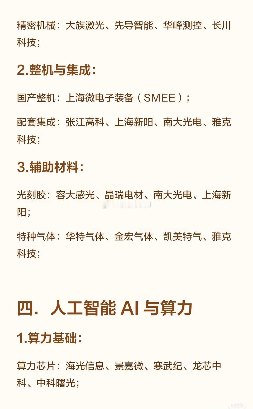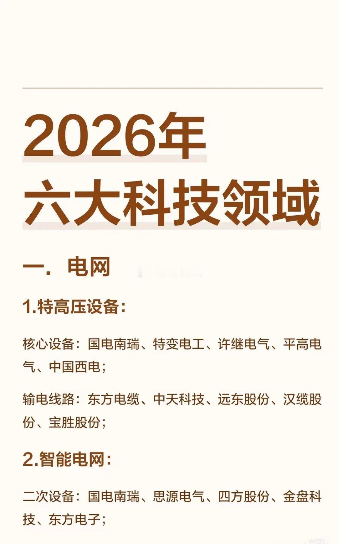 2026年六大科技领域核心解读一、电网以特高压为骨干网架,智能电网与数字化技术深度融合,储能配套全面升级,构建清洁低碳、安全高效的新型电力系统,支撑新能源大规模并网与双碳目标落地。二、太空光伏突破空间太阳能关键材料与核心器件,通过在轨电池制造与系统集成,将太空清洁能源转化为可利用电力,开启“太空发电站”商业化探索,为地球提供零碳能源新方案。三、光刻机国产整机与核心部件加速突破,光学系统、精密机械与辅助材料协同攻关,推动高端芯片制造自主可控,破解“卡脖子”难题,筑牢半导体产业发展根基。四、人工智能 AI 与算力算力芯片、液冷服务器与光模块支撑算力底座升级,AI Agent、SORA等应用场景落地,从“算力爆发”迈向“智能普惠”,驱动全行业数字化转型与生产效率革命。五、人形机器人精密传动、动力执行与感知系统迭代提速,具身智能从实验室走向量产,在工业制造、服务场景实现规模化应用,重构人机协作模式,成为新质生产力的重要载体。六、无人驾驶感知层多传感器融合、决策层芯片与算法突破,推动L3+自动驾驶规模化落地,重构出行与物流效率,构建“车路云一体化”智能交通生态,开启智慧出行新时代。人工智能人工智能机器人航天新能源汽车技术