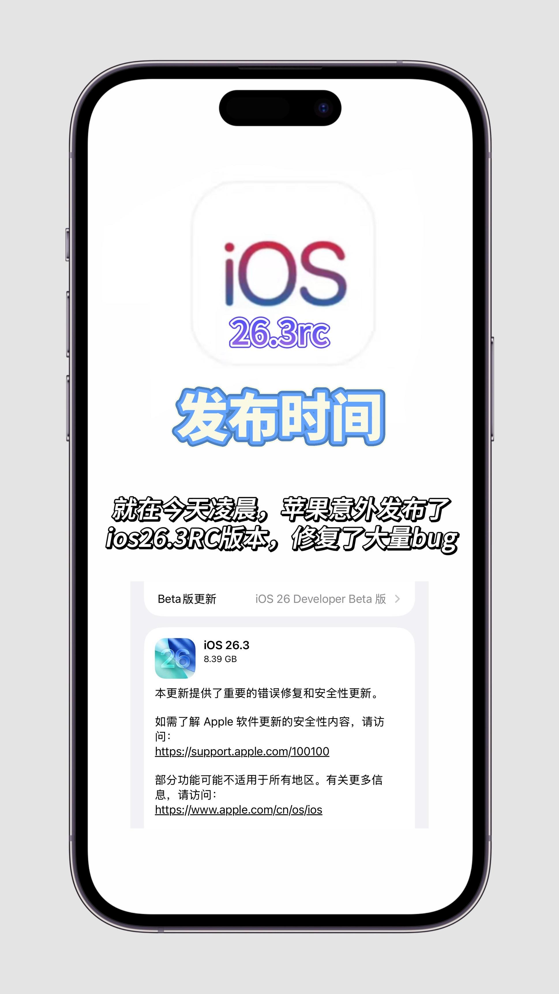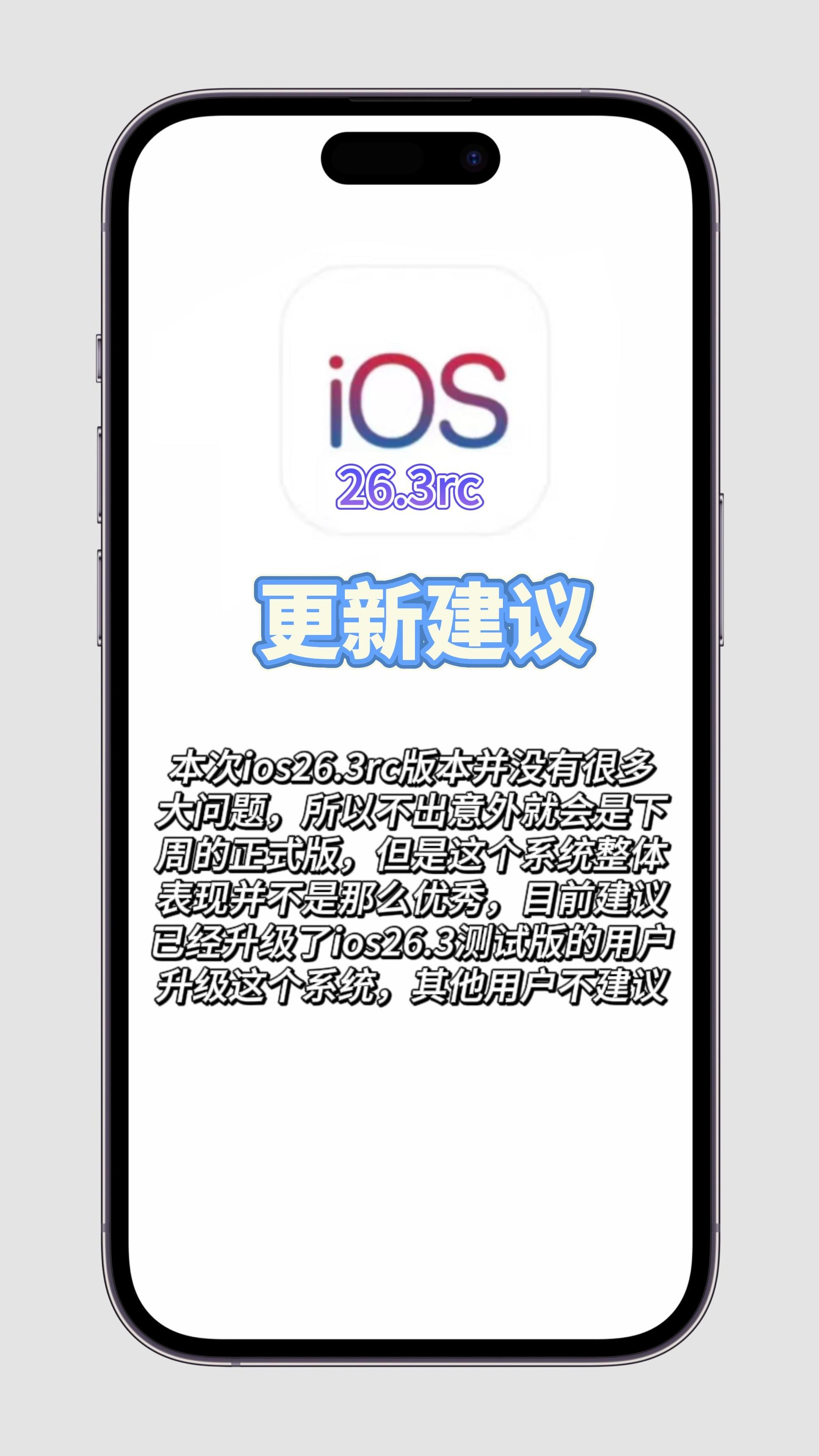 ios26.3Rc版本发布,谨慎升级。这次ios26.3Rc版本来的很意外,但是这个系统并没有什么大问题,虽然很正常,还是不建议升级,毕竟性能续航没有什么好的优化,建议大家等待一下下周的正式版再看看