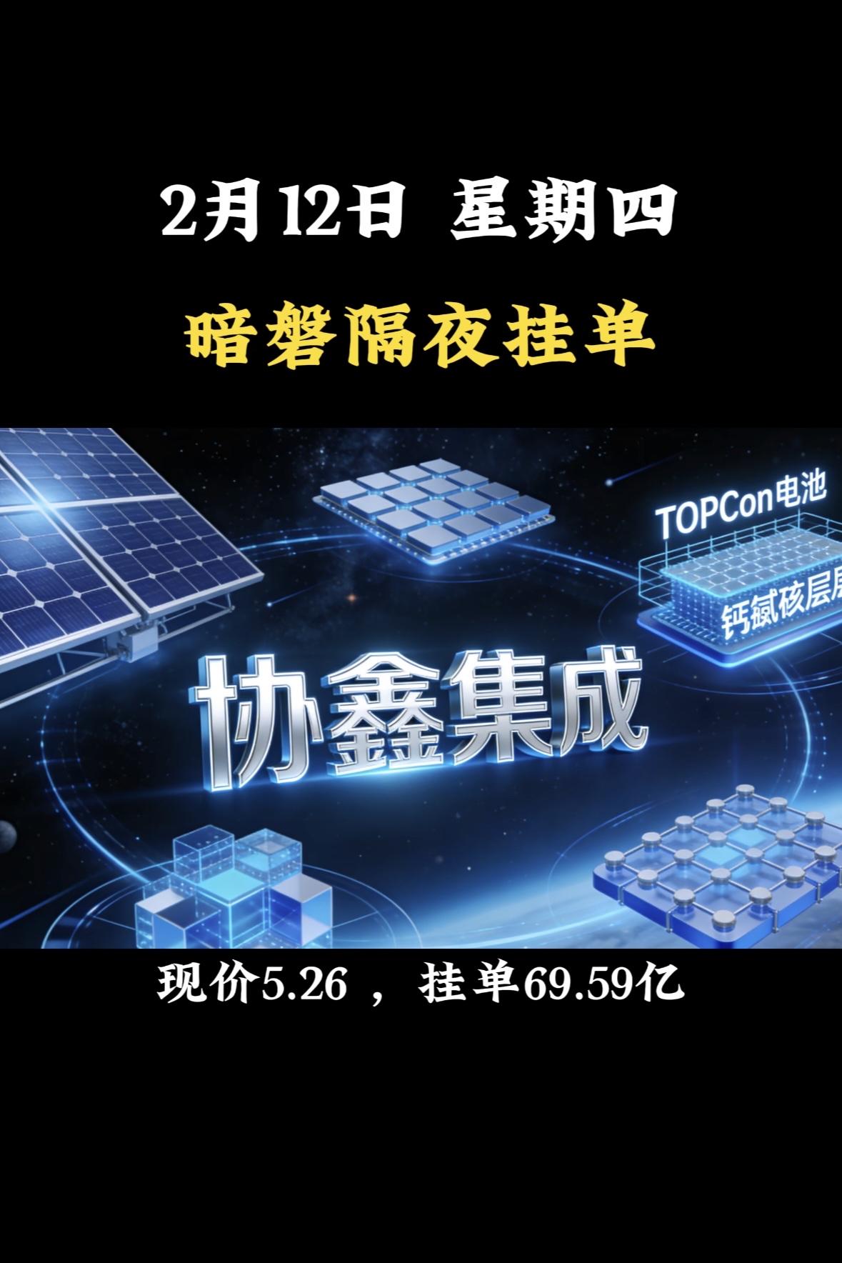 2月12日暗磐隔夜挂单,协鑫集成,现价5.26,挂单69.59亿! AI概念股暗盘挂单激增,资金抢筹意图明显,市场热度持续攀升。