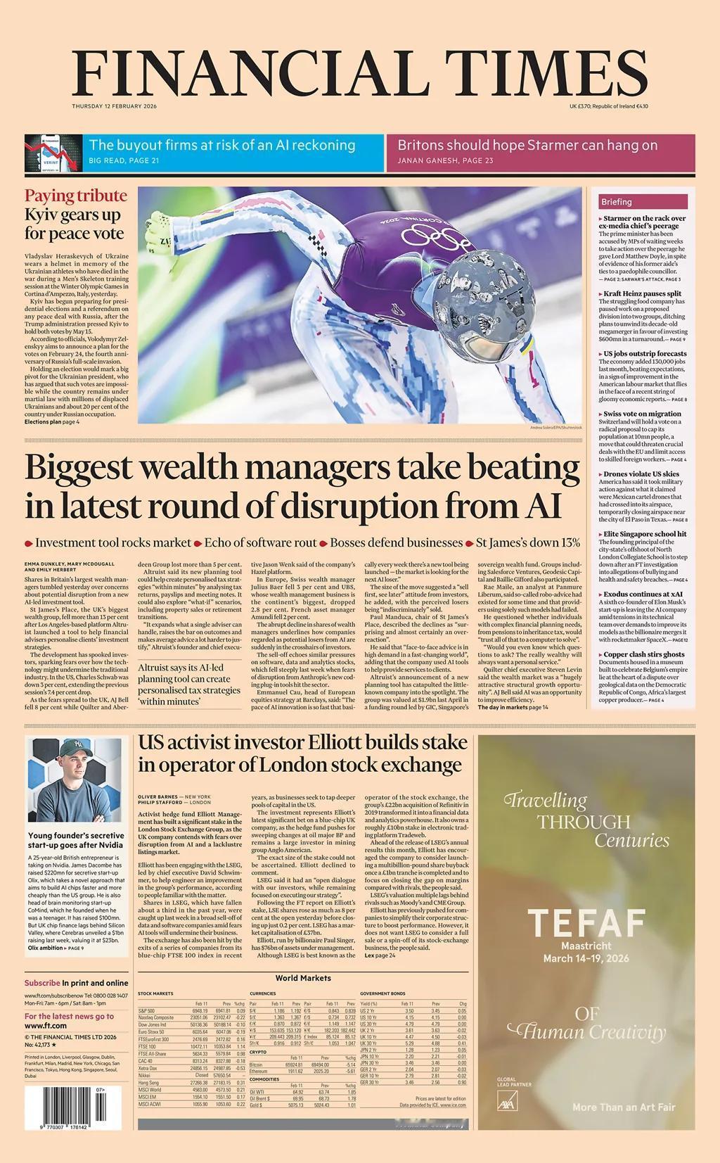 《金融时报》头版报道,“消费”俄乌战争是该报获取更高流量的不二法宝。 致敬基辅筹备和平投票。照片显示, 昨天,在意大利科尔蒂纳丹佩佐举行的冬奥会男子雪橇训练中,乌克兰的弗拉迪斯拉夫·赫拉斯凯维奇戴着头盔,以纪念在战争中牺牲的乌克兰运动员。 在美国政府施压下,基辅已开始筹备总统选举以及就与俄罗斯的任何和平协议举行全民公投,要求两项投票在5月15日前举行。 据官员称,弗拉基米尔·泽连斯基计划于2月24日,即俄罗斯全面开战四周年之际宣布投票计划。 举行选举对这位乌克兰总统来说将是一个重大转变,他此前曾表示,在该国仍处于战时状态、数百万乌克兰人流离失所且约20%的国土被俄罗斯占领的情况下,举行此类投票是不可能的。 另外该报关注了,英国最大财富管理公司的股价因对潜在人工智能投资工具的担忧而下跌。