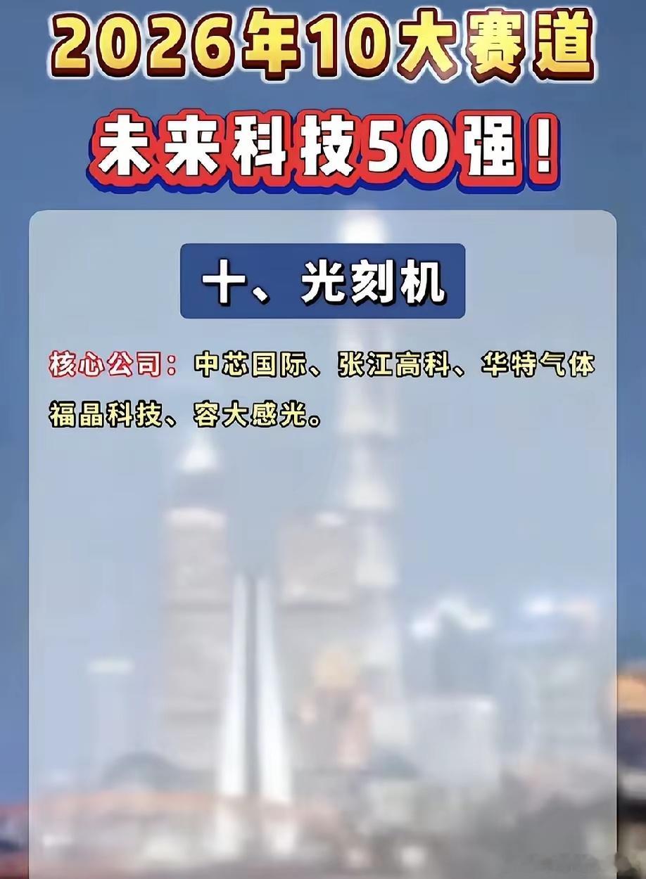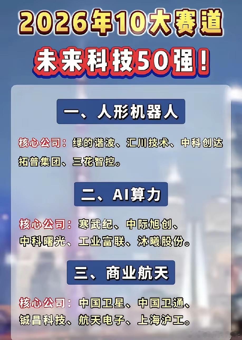2026年未来科技10大赛道龙头名单曝光!从人形机器人到光刻机,从AI算力到可控核聚变,50家核心公司全梳理,精准锁定科技主线投资机会,收藏这一份就够了!AI算力核心逻辑:大模型迭代与AI应用爆发,算力需求呈指数级增长,GPU、服务器、光模块等基础设施成为核心瓶颈,国产替代空间巨大。行业龙头代表中科曙光。存储芯片核心逻辑:AI服务器与消费电子复苏带动存储需求回暖,国产厂商在DRAM/NAND领域技术突破,行业周期触底回升。行业龙头代表长鑫存储。人形机器人核心逻辑:工业自动化升级+人口老龄化催生劳动力替代需求。行业龙头代表拓普集团、三花智控……