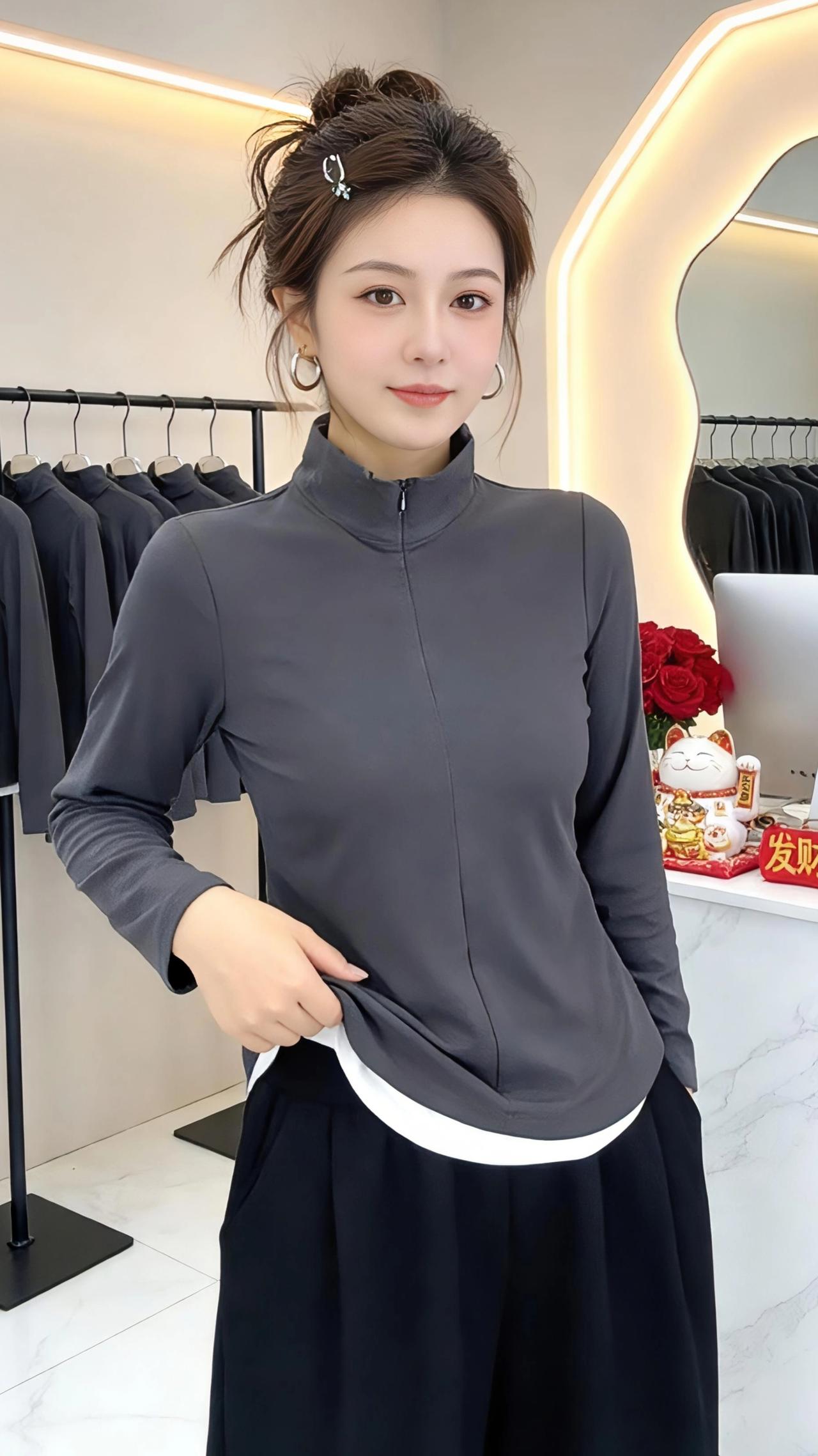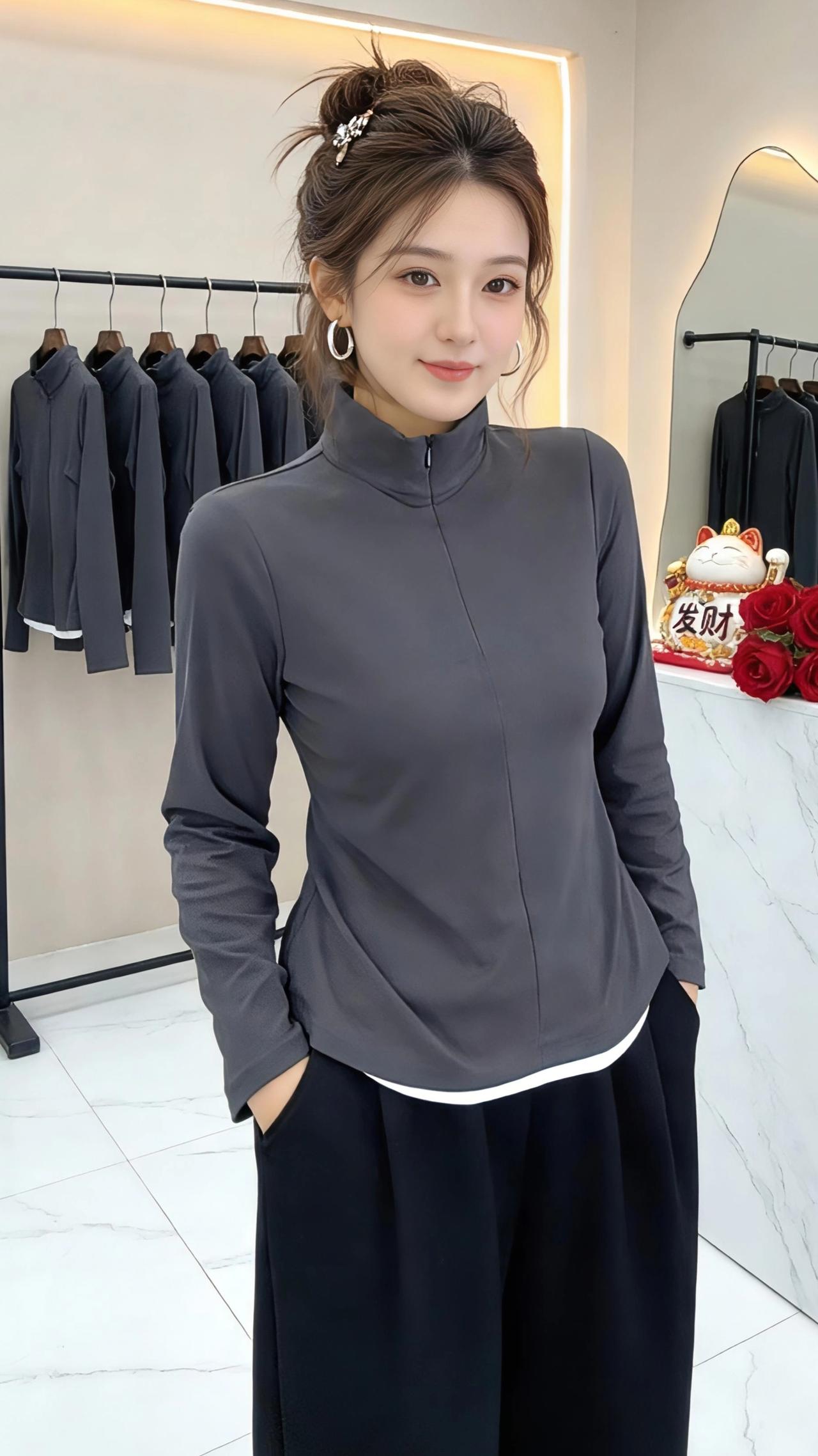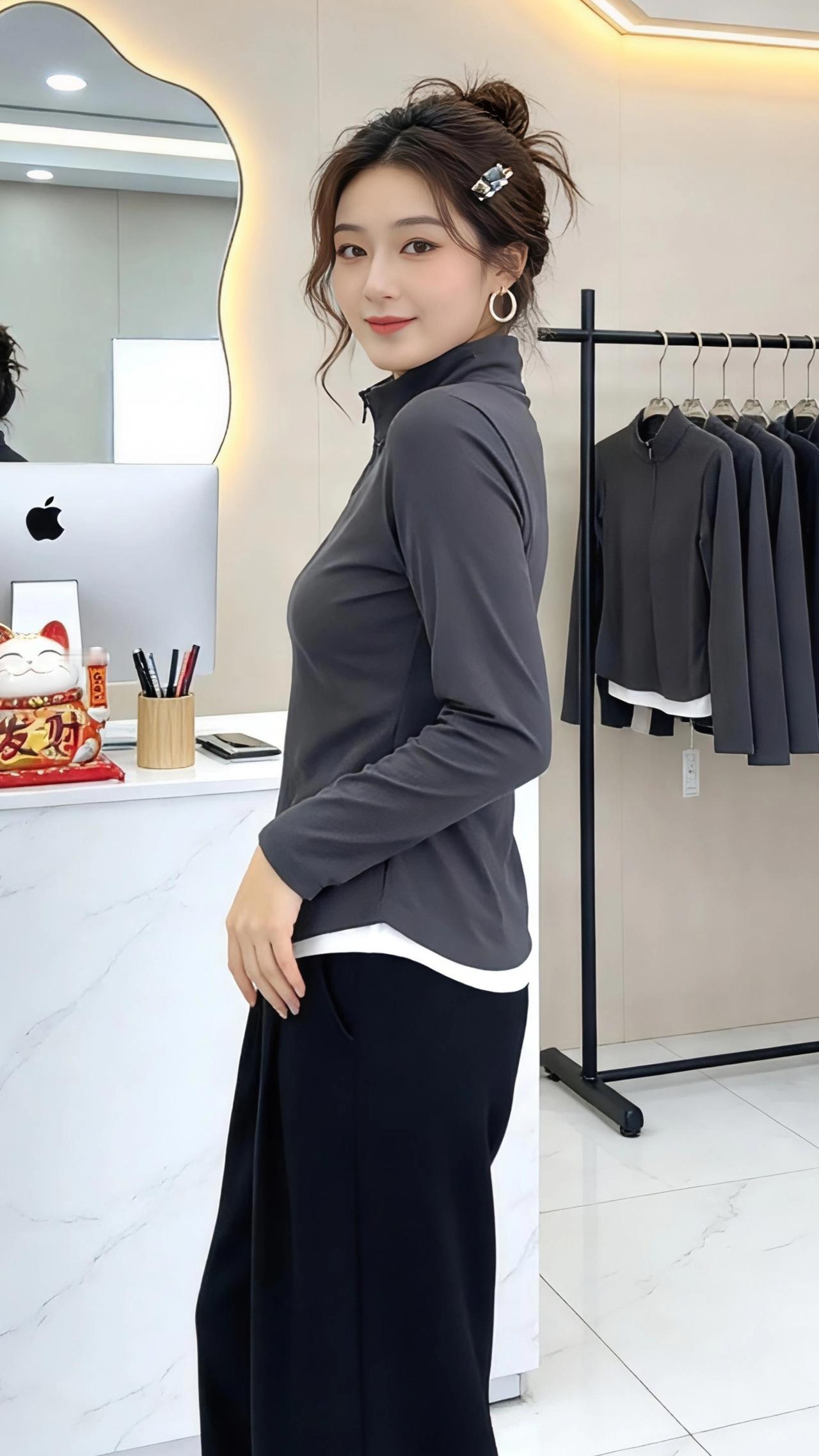 灰调里的温柔 暖光漫过镜面,把空间晕成一片柔和的底色。深灰的立领衫像一层细腻的雾,贴在肌肤上,带着恰到好处的妥帖。 拉链半开,露出颈间的留白,下摆处的白边轻轻翻折,像藏在衣料里的一抹月光。她抬手轻捻衣角,或是将手插进裤袋,丸子头的碎发随着动作轻晃,耳间的银环在光里闪着细碎的光。 身后的衣架上,同款衣衫静静排列,像是等待被认领的温柔。台面上的红玫瑰热烈,招财猫憨态可掬,却都被这一身灰调轻轻收束,成了恰到好处的点缀。 这不是张扬的美,是藏在日常里的松弛与从容。它裹着风,也裹着不慌不忙的底气,让每一个平凡的时刻,都多了几分沉静的诗意。 高级感穿搭 新年穿搭 冬季穿搭 加绒T 恤