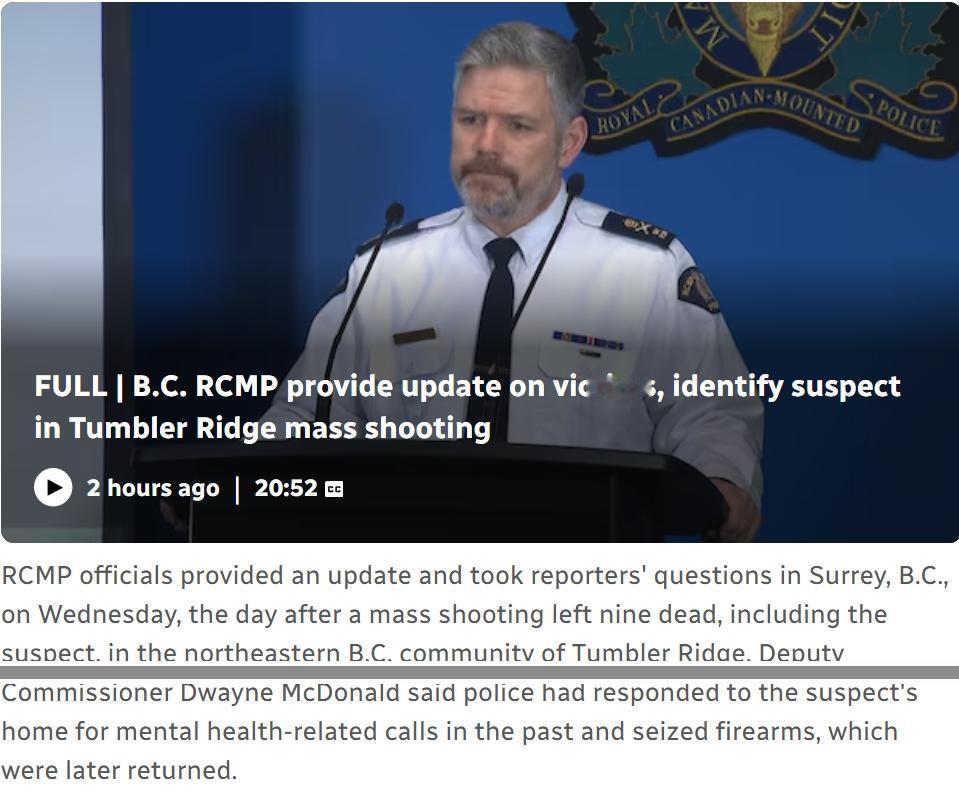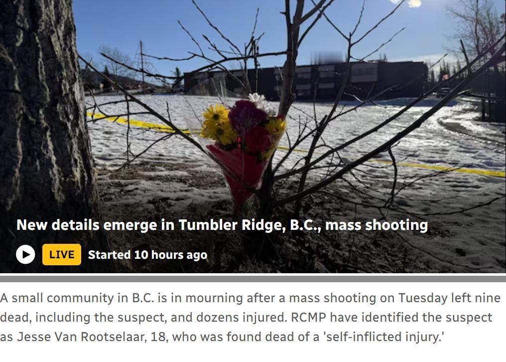 加拿大发生大规模校园枪击事件,9人死亡,27人受伤 当地时间周二,加拿大BC省发生一起大规模枪击事件,事件造成包括枪手在内的9人死亡,27人受伤,这是加拿大历史上最严重的校园枪击事件之一。 警方已确认嫌疑人为18岁的杰西·范·鲁特塞拉尔,是该学校一名辍学且持枪执照过期的前学生,他在警察赶到现场前死于“自残伤害”。杰西·范·鲁特塞拉尔被认为在学校枪击案发生前,还在家中杀害了两名亲属。 BC省皇家骑警指挥官今天提供了关于事件详细更新。副专员德韦恩·麦克唐纳表示: 警方于周二下午1:20左右接到报警,赶赴坦布勒岭中学。 警方进入学校建筑物,发现疑似枪手杰西·范·鲁特塞拉尔(Jesse Van Rootselaar),18岁,死于自杀枪伤。 一名教育工作者和五名学生在学校内被发现死亡:一名39岁的女教师、三名12岁女孩和两名男孩:一个12岁,另一个13岁。其中一人在楼梯间被发现,其余尸体则在学校图书馆被发现。 麦克唐纳说,范·鲁特塞拉尔的母亲(39岁)和弟弟(11岁)在学校枪击案发生前在家中被杀,但直到下午2:45才被发现。邻居在家里一位年轻女性亲属前去求助后报警。 警方在过去几年多次因心理健康报警前往范·鲁特塞拉尔家中,最近一次是在春季。范·鲁特塞拉尔自认是女性,但出生时被指定为男性。她大约六年前开始变性,于四年前辍学。 校内警员缴获了一把长枪和一把改装手枪,都未登记在范·鲁特塞拉尔名下,但他的枪支许可证已于2024年到期。 警方未透露动机,并表示警方尚未发现任何遗书。