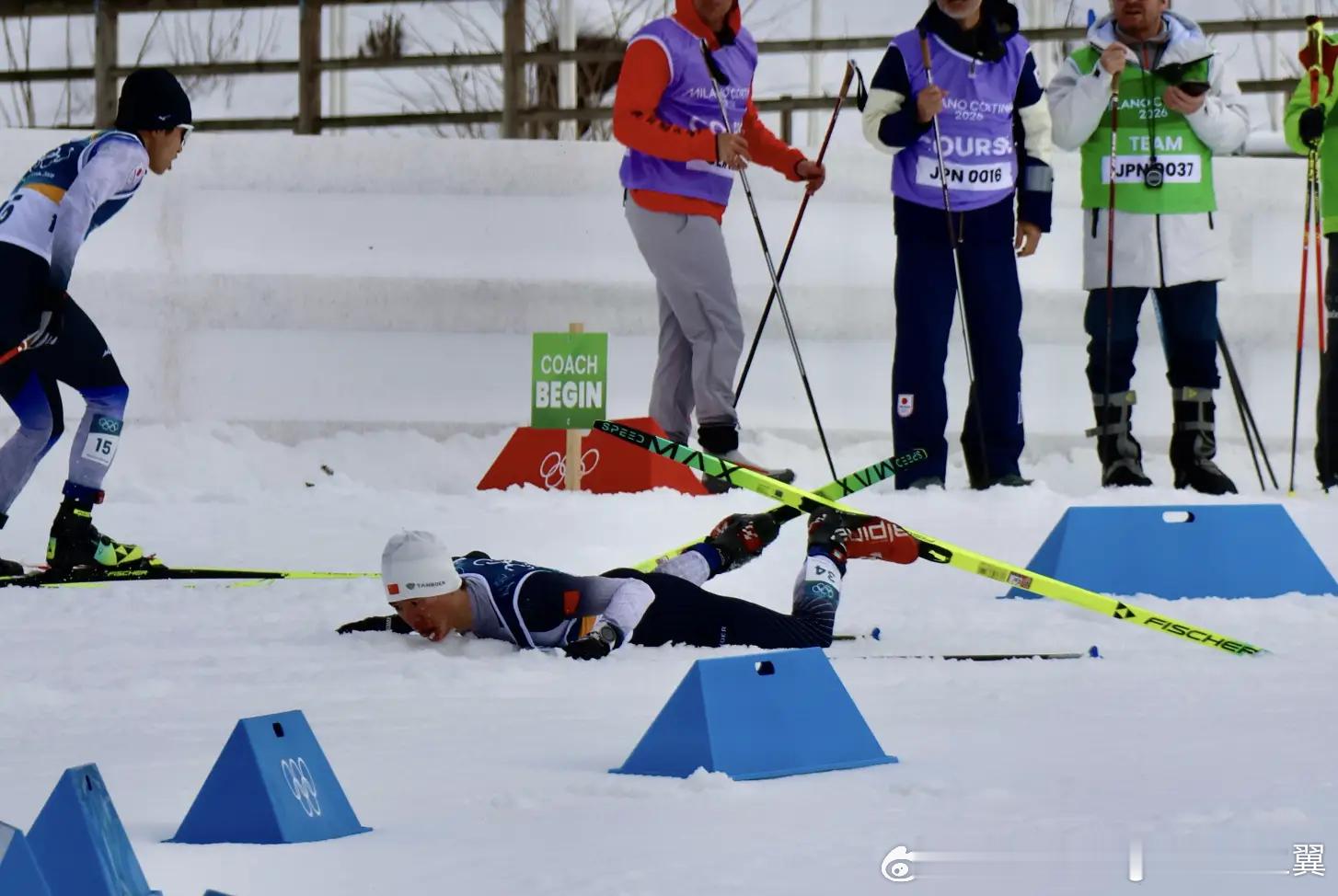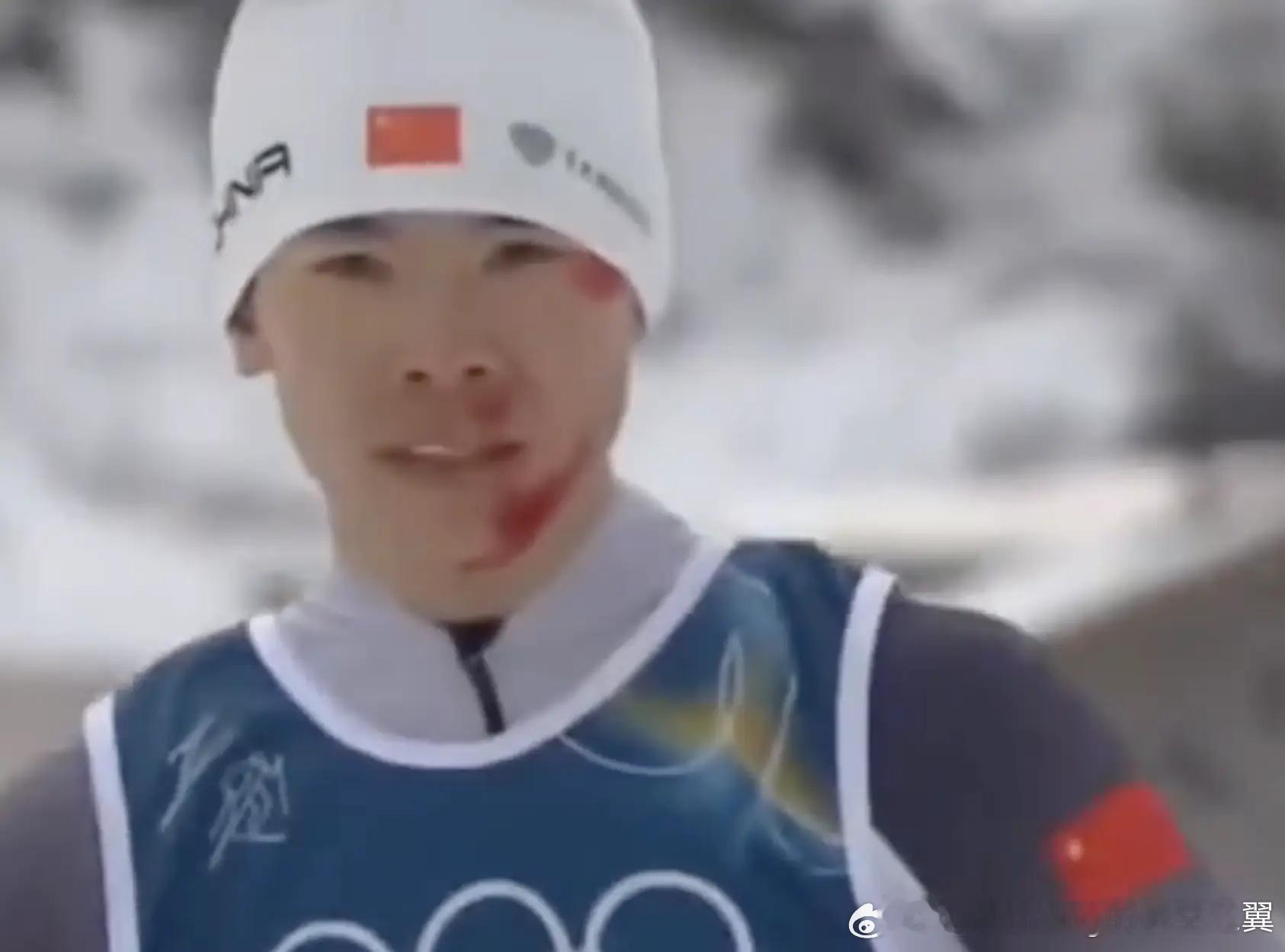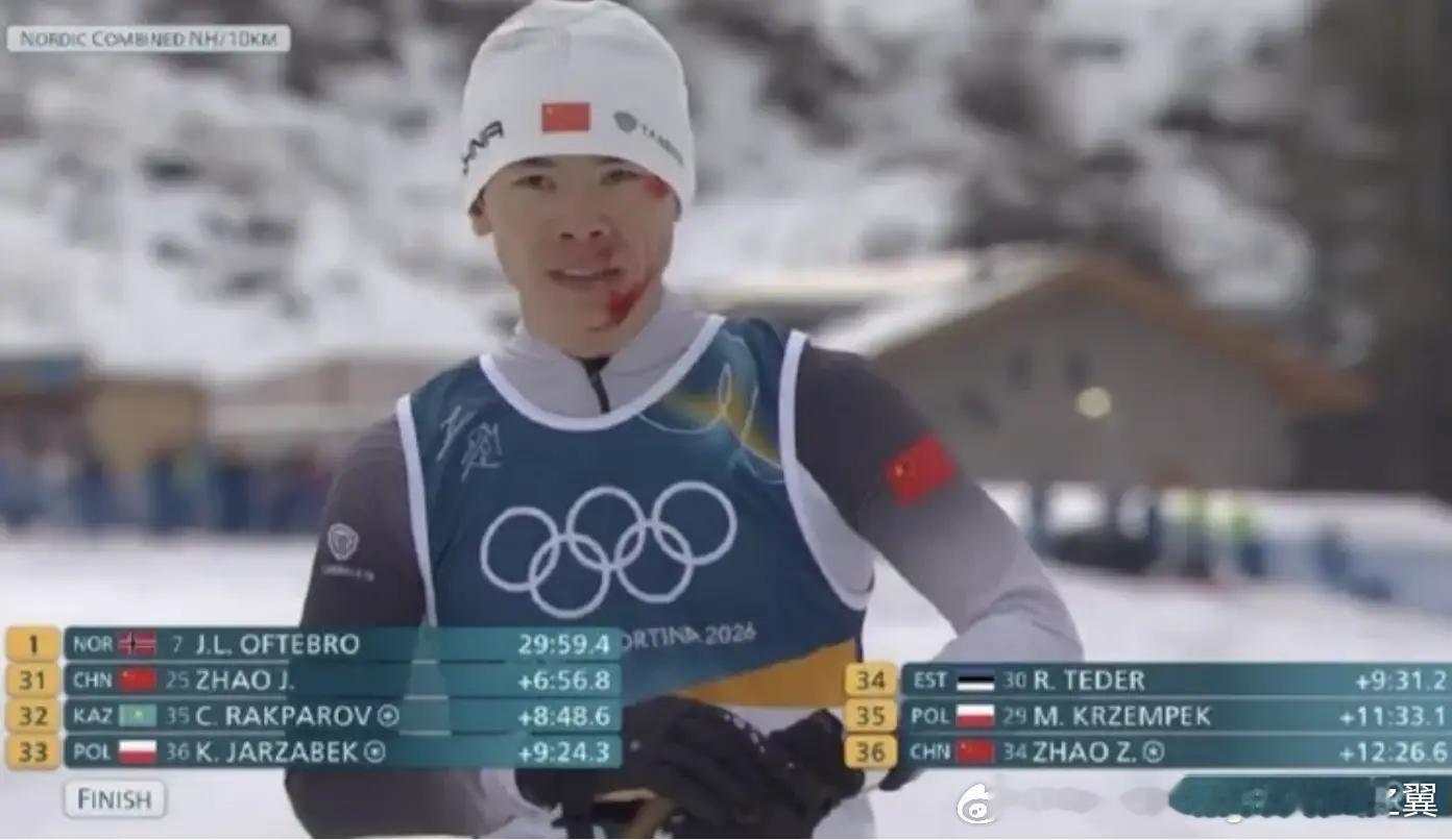 中国队员面带鲜血过终点线在2026年米兰-科尔蒂纳丹佩佐冬奥会上,中国选手赵子