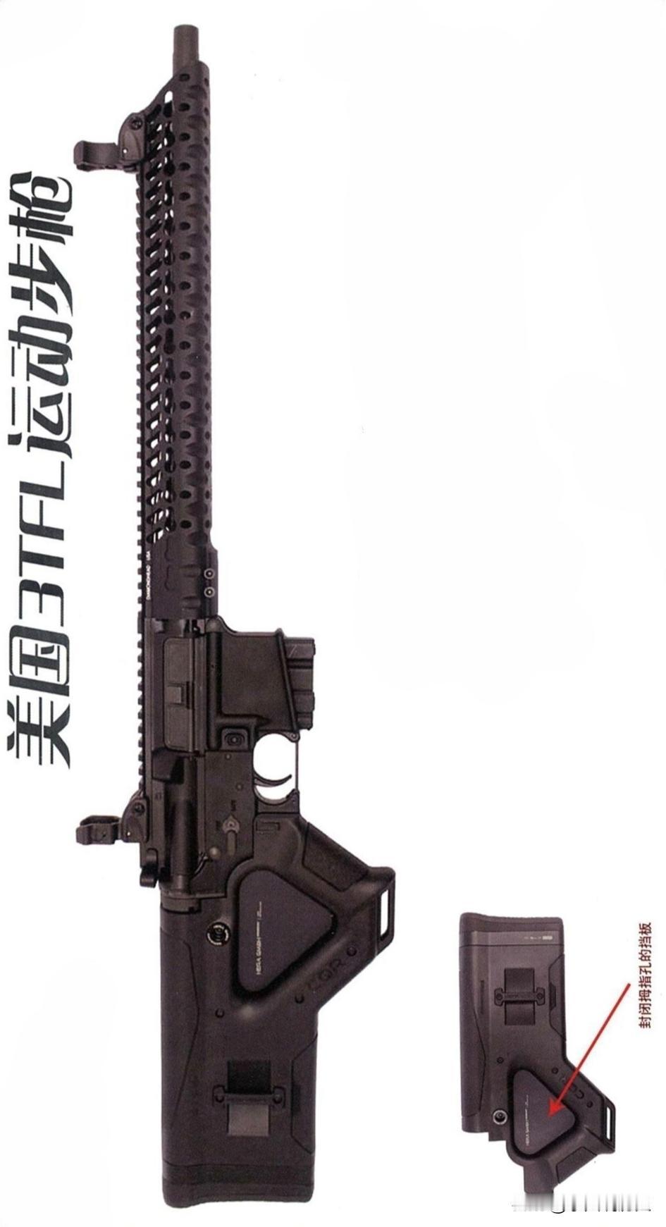 美国3TFL运动步枪 STAG公司推出的3T系列长枪,是三枪竞技比赛的专用战术枪,3TFL民用运动长枪是它的民用版本。 美国市场上的民用半自动长枪有严格配置规定,握持把、可拆卸弹仓、枪口配件等配置,一把枪最多只能有两种。 所以美国民用长枪大多装固定伸缩枪托,没有枪口配件和刺刀座,枪口留了螺纹口,用户可以自己加装配件。 3TFL民用长枪用AR15的机匣,护木上窄下宽,导轨连为一体,护木上下有不同散热孔,枪口没有装配件。它的枪托设计很特别,和FN P90很像,拇指孔被挡片封住,符合销售规定,拆挡片就能用握把。